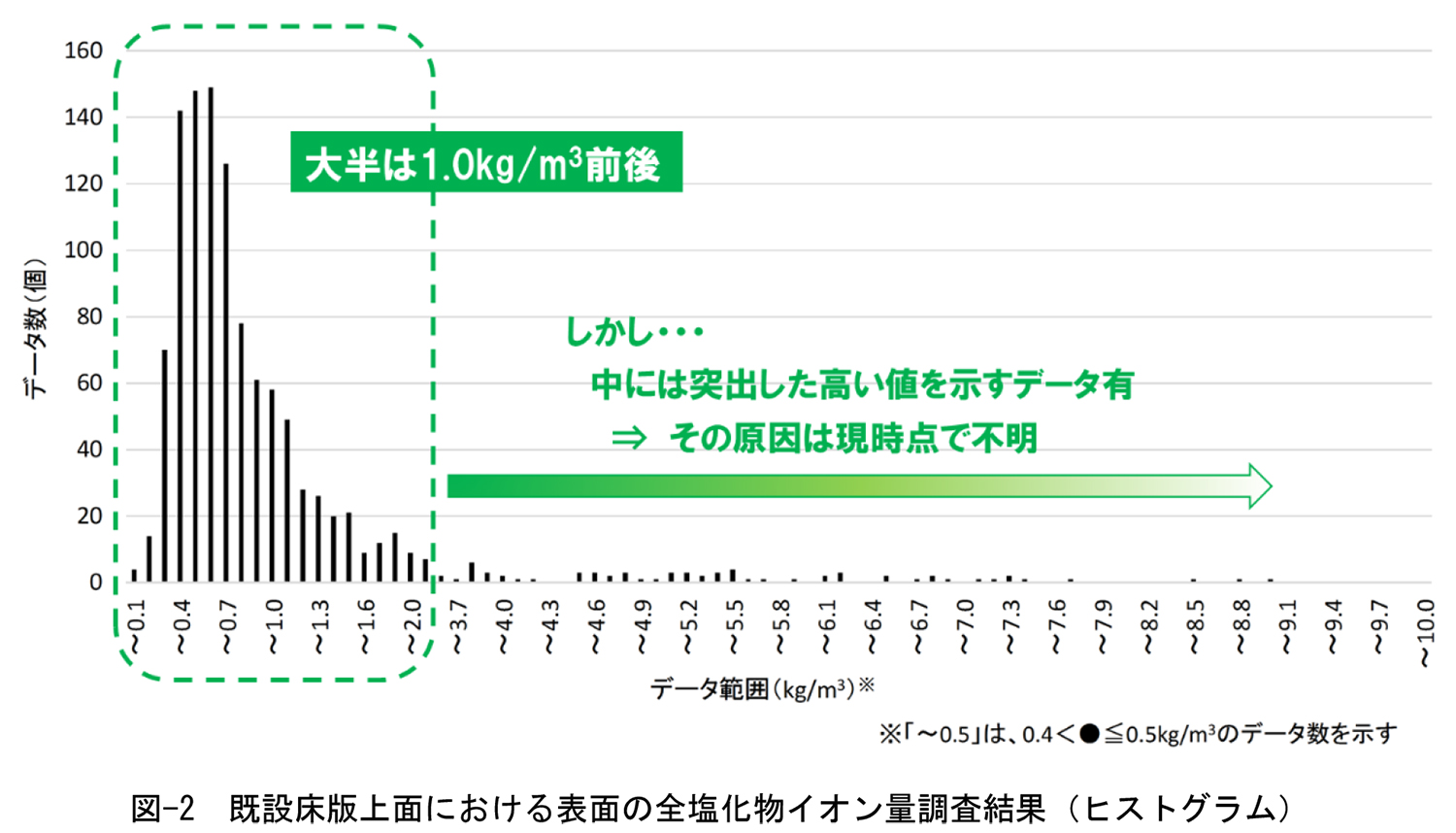 図-2は、平成27~28年度に実施した塩分量調査データに基づき、床版上面(表面)の全塩化物イオン量の頻度分布について整理した結果である。この調査データは、NEXCO中日本が管理する中央道、北陸道、名神などの雪氷区間において実施されたものであり、調査データの条件は、次のとおりである。