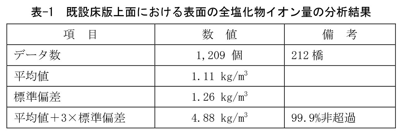 既設橋では、既設床版上面の塩分量データを取得できるため、実状に近い条件でコンクリート表面の塩化物イオン濃度を設定することが可能である。このことから、照査に用いる表面塩化物イオン濃度C0の設計値は、床版取替えの対象橋梁において凍結防止剤散布による環境作用の影響を適切に評価できる十分な量の調査データに基づいて設定することを基本とした。一方で、これまでに実施した塩分量調査結果に基づき、当面の間、設計で使用するための標準値についても別途定めることとした。