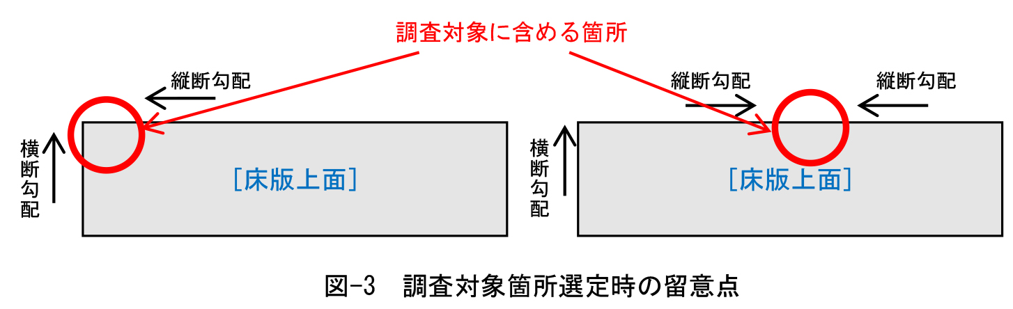(d) 調査箇所は、横断勾配の低い路肩側(地覆端から500mm程度)を基本とする。(図-3)