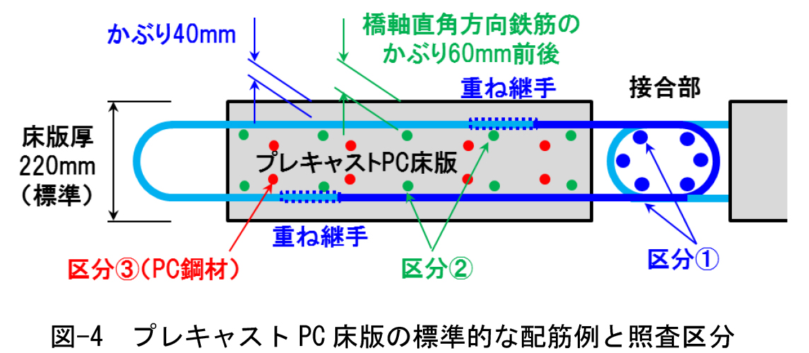 鉄筋やPC鋼材の防せいの要否や種別の判定は、図-4に示す区分①~③に分類し、それぞれの区分に対して床版上面側の鋼材を対象とした照査を行うこととしている。ここで、区分①は接合部の鉄筋及びプレキャスト部材から接合部へ延長する橋軸方向の鉄筋、区分②はプレキャスト部材のみに配置される鉄筋、区分③はプレキャスト部材に配置されるPC鋼材である。こうした区分は、照査の簡便性や品質管理のしやすさを考慮して、防せい仕様の使い分けが最小限となるように設定したものである。なお、図-4ではループ継手を例示しているが、他の継手構造を用いる場合も同様の考え方で防せい区分を設定できる。