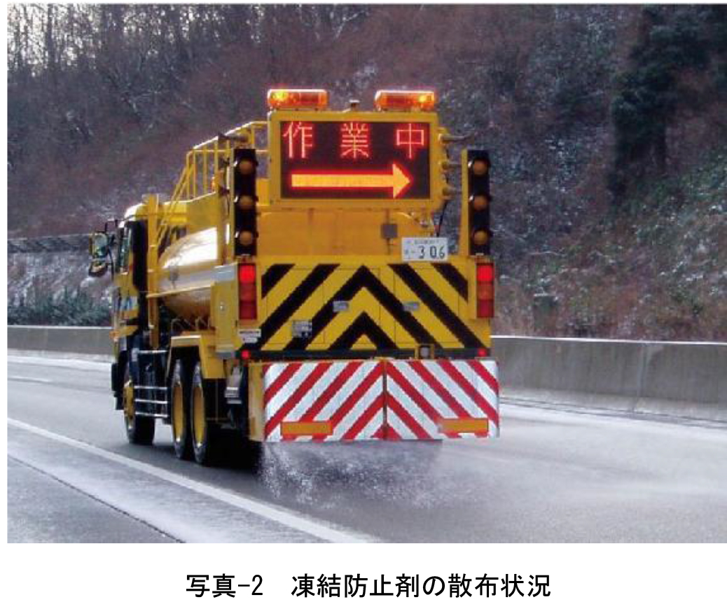 壁高欄は、冬季に散布される凍結防止剤(写真-2)が飛散する影響を直接受ける。このため、塩害による劣化事例が多く、この環境作用に対する耐久性照査が特に重要な部材である。