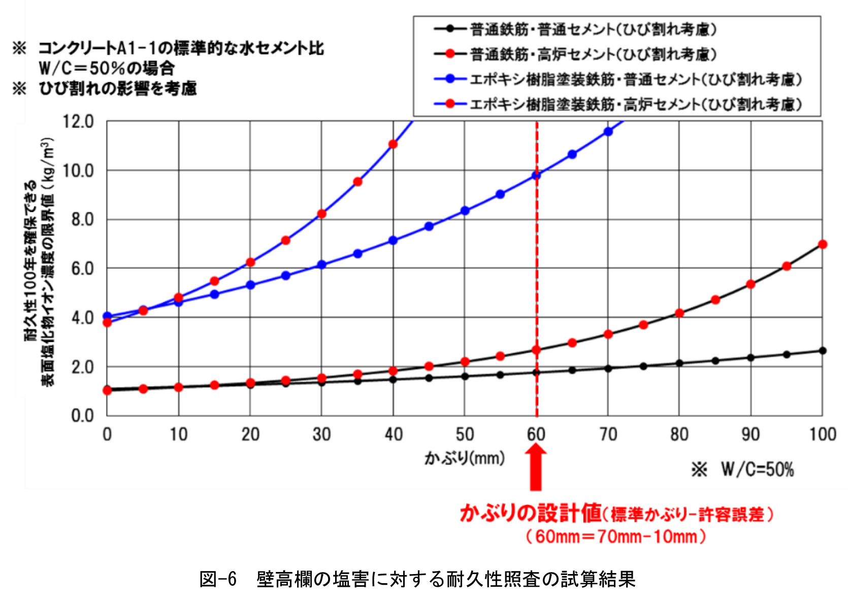壁高欄の耐久性照査結果を図-6に、鋼材の防せい対策や混和材を用いた耐久性向上対策の組合せに対する表面塩化物イオン濃度C0の限界値を試算した例を表-3に示す。この手法により、凍結防止剤散布量やかぶりの設計値に応じて、壁高欄の耐久性を確保するための対策を選定できる。