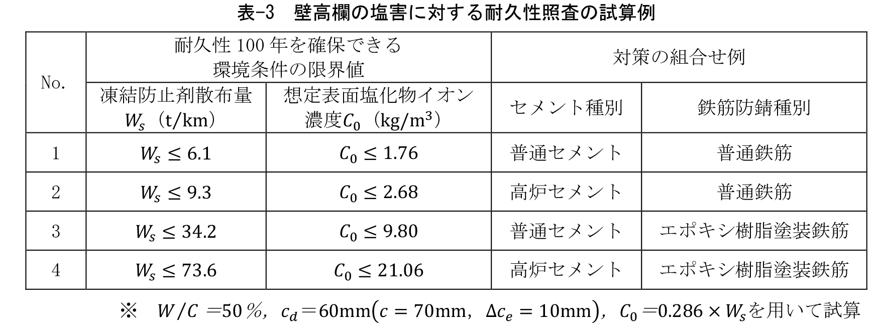 ここに、Ws :年間あたりの凍結防止剤散布量(t/km)。既往の凍結防止剤散布量の実績データを用いる。ここで、式(3)は、高速道路橋の橋梁壁高欄を対象とした調査結果に基づいて求められたものであり、これによりコンクリート表面における想定塩化物イオン濃度を算定できる可能性が高いことが、文献6)において示されている。ただし、1シーズンあたりの凍結防止剤散布量が5.95~22.69(t/km)のデータに基づいているため、これを大幅に上回るような重雪氷地域においては、適用に注意が必要である。