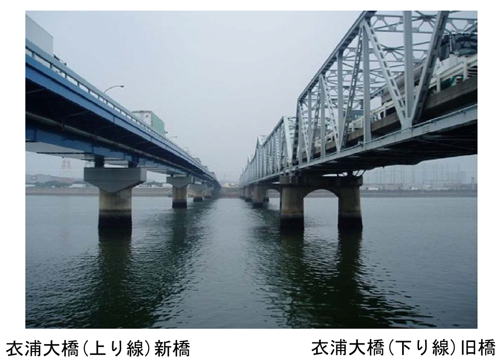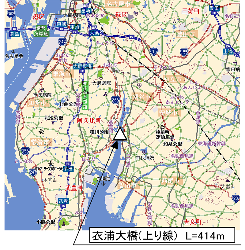 衣浦大橋(上り線)は、愛知県の衣浦港にかかる、昭和52年竣工の橋長413.6m、臨海工業地帯と西三河地方の工業地域を結ぶ、緊急輸送路上の重要な橋梁のひとつである。昭和30年に架設された2車線の鋼ゲルバートラス橋の南側に新橋として架設され、旧橋を下り線、本橋を上り線として増大する交通に対応している。ちなみにこの旧橋は日本で初の海上橋で(両岸が埋め立てられる前の)当時は東洋一の橋長であったと聞いている。