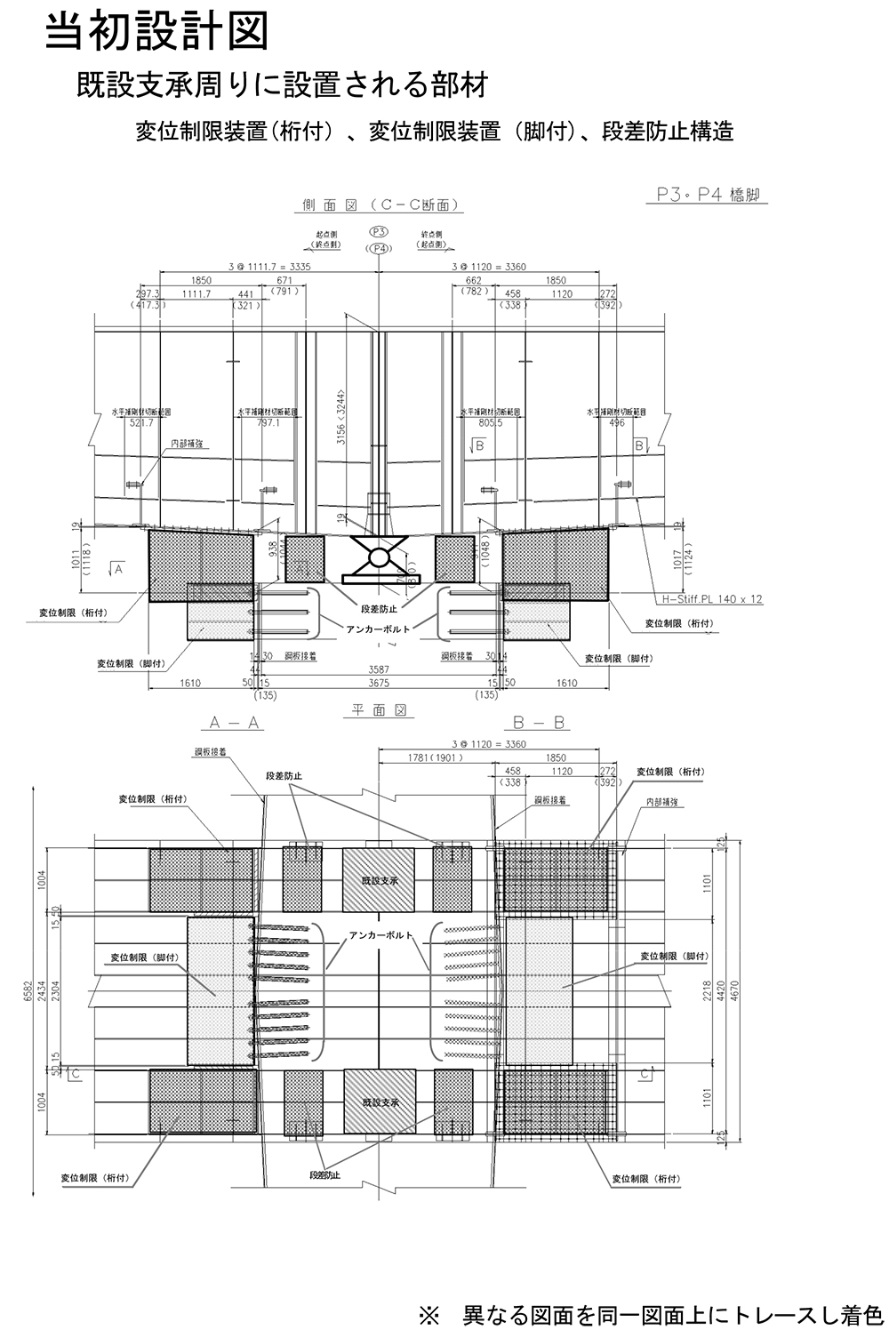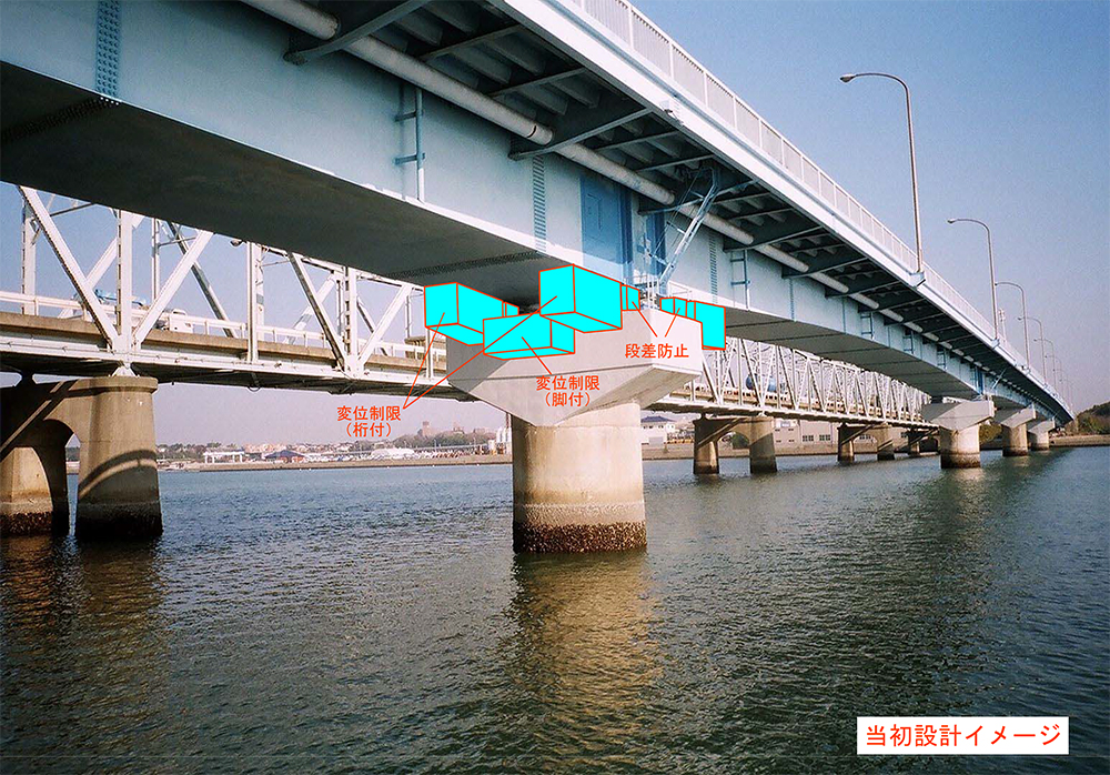 上部工対策の当初設計は、桁端部へ落橋防止装置を設置するとともに、既設支承をタイプA支承(H14道示のレベル2 地震に耐えられない構造)と位置付け、既設支承を残し、支承周りに変位制限装置を取り付け、支承部をレベル2地震に対応させる設計であった。