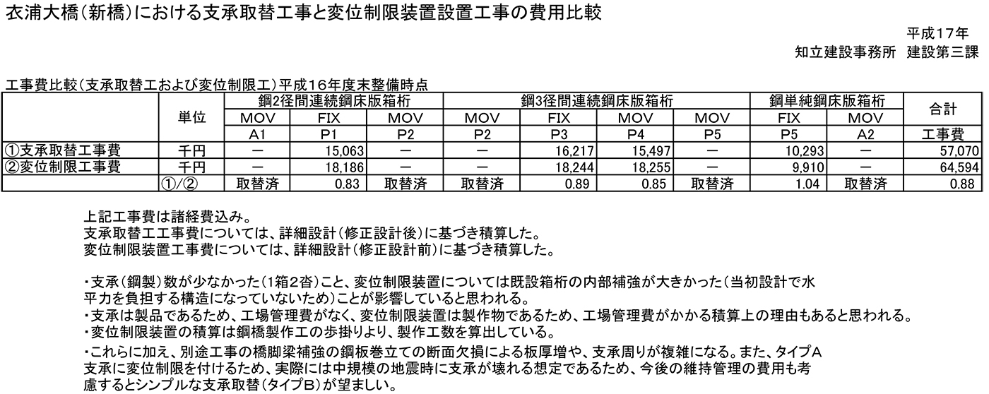 費用比較すると支承取替が経済的となった。これは支承あたりの反力が大きく、変位制限装置が大掛かりなものになったこと、架設当時に水平力を考慮されていない鋼箱桁内部に補強部材が必要となったこと、取り替える支承がゴム沓でなくBP-B(鋼製)沓であったことなどが考えられる。これに加えてアルカリ骨材反応対策の橋脚梁補強鋼板に孔を開けない分、設計上鋼板厚を薄くできたメリットもあった。