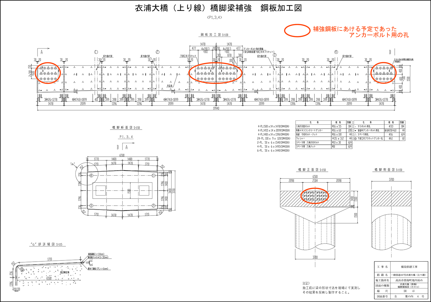 橋脚梁補強の施工は、供用中の橋脚梁に密に配筋されている鉄筋を避けて、アンカーの定着長を確保して削孔をする。すべてのアンカー削孔が完了してから、孔の配置をトレースし、設計再計算して補強用の鋼板厚を決定し、製作図を起こす。鋼板厚が変われば鋼材メーカーに材料手配して、鋼材納入後に工場にて補強鋼板を製作する……。今思えばそんなことからも施工困難と判断すべきとわかる。