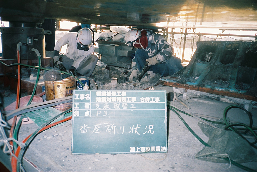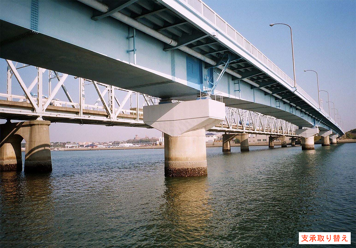 平成15年にP5 橋脚上のローラー支承のローラーが逸脱した。急遽、当時愛知県の防災アドバイザー(名古屋大学教授)を中心とした委員会が構成され、検討の結果、損傷のあったP5 橋脚、A2橋台上を同年、翌年にはP2 橋脚、A1 橋台上の同形状のローラー支承をタイプB(H14道示のレベル2 地震に耐えられる構造)の可動支承(BP-B沓)に取り替えている。