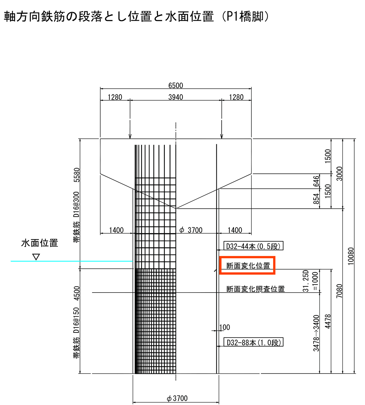 当該橋梁の橋脚は正円の単柱式鉄筋コンクリート橋脚であり、すべての橋脚の軸方向鉄筋に「段落とし」が存在した。この「段落とし」が水中部にあったことから、費用のかさむ仮締切の施工が必須となる。このため「段落とし」部分のみを繊維シートで巻立て補強するのではなく、橋脚基部を含む柱全体を鉄筋コンクリートで巻立てて補強する方針とした。