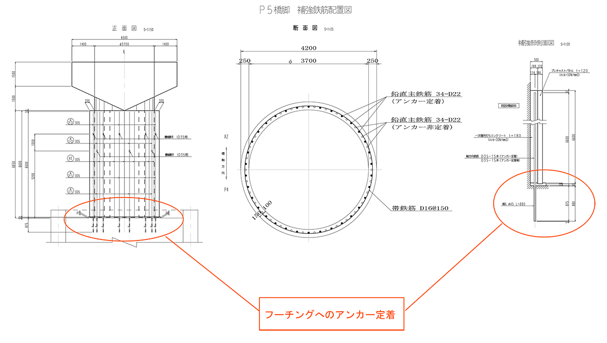 橋脚基部のじん性補強となる鉄筋コンクリート巻立てに加え、橋脚基部の耐力をレベル2 地震に耐えられる補強にするためには、軸方向鉄筋をフーチングへ定着(曲げ補強)をする必要があったが、橋脚基部の耐力を上げると基礎への負担が大きくなり、基礎を補強する必要が出てくる。基礎の補強は工費も膨大となることから、橋脚基部の曲げ補強を見送る場合が多かった。