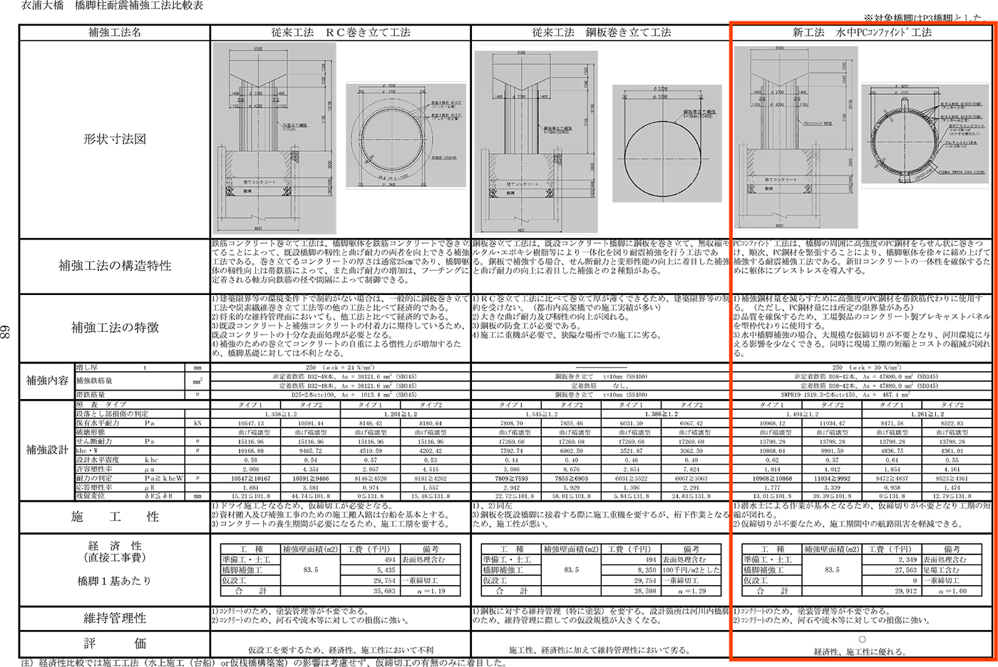 補強工法の選定にあたっては、通常工法の鉄筋コンクリート巻立てとした場合、ドライ施工のため、仮締切りが必要となる。この橋梁は港湾内の軟弱地盤上に橋脚の基部があり、締め切り鋼矢板の延長が長くなること、上空には桁があり施工費が割高になることや、陸路からの材料搬入路となる仮桟橋が航路などへの影響もあり設置困難であったこと、予算確保上の観点(予算に併せて1 橋脚単位で施工が可能)から、仮締め切りの要らない水中「PCコンファインド工法」を台船により施工する工法を採用することとなった。