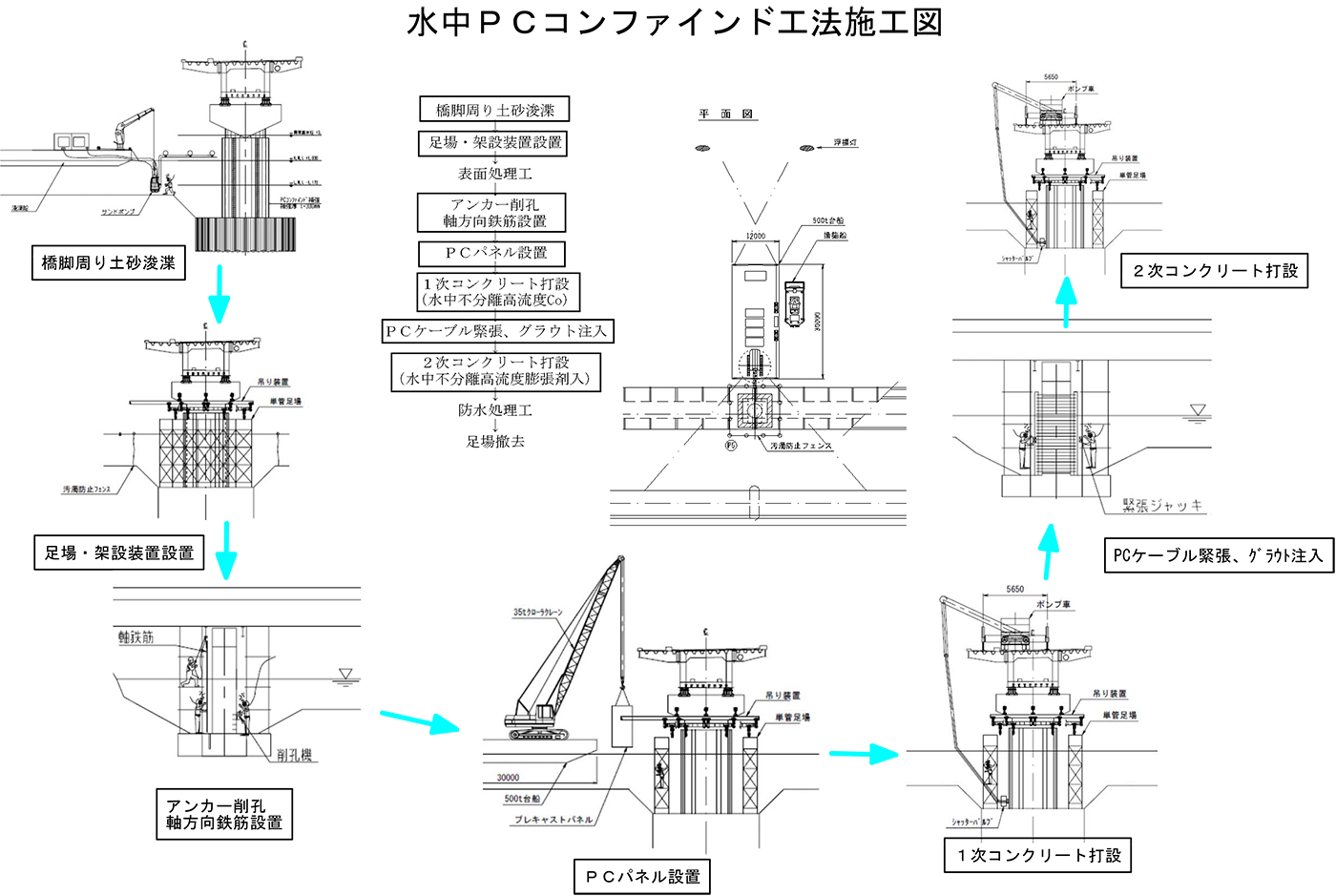 「PCコンファインド工法」は橋脚耐震補強工法のひとつで、橋脚まわりに軸方向鉄筋を配し、その外側を取り囲む形でプレキャスト型枠を本設部材として設置し、コンクリートを打設した後、プレキャスト型枠にあらかじめ螺旋状にセットしたシースにPC鋼線を挿入・緊張し、補強する工法である。水中にある橋脚を補強する場合、コンクリート打設に水中不分離コンクリートを使用し、作業を潜水士によって水中施工することで、仮締め切りの要らない橋脚補強工法とされている。