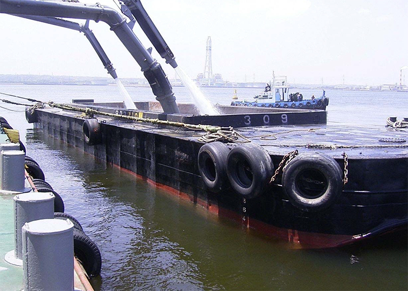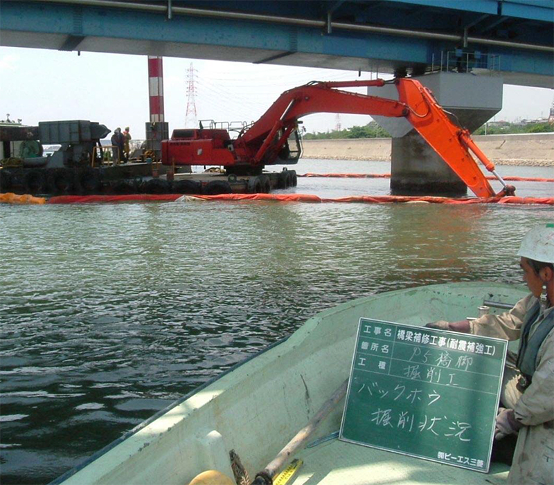 水中土工では、フーチング上の土被りがどんな状態か事前にはわからなかったが、大半がヘドロであると想定し、バックホウ浚渫とバッキューム浚渫を併用したが、土砂搬出の揚土船が港に一台しかなく、揚土船の手配等に担当者はとても苦労したと聞いた。