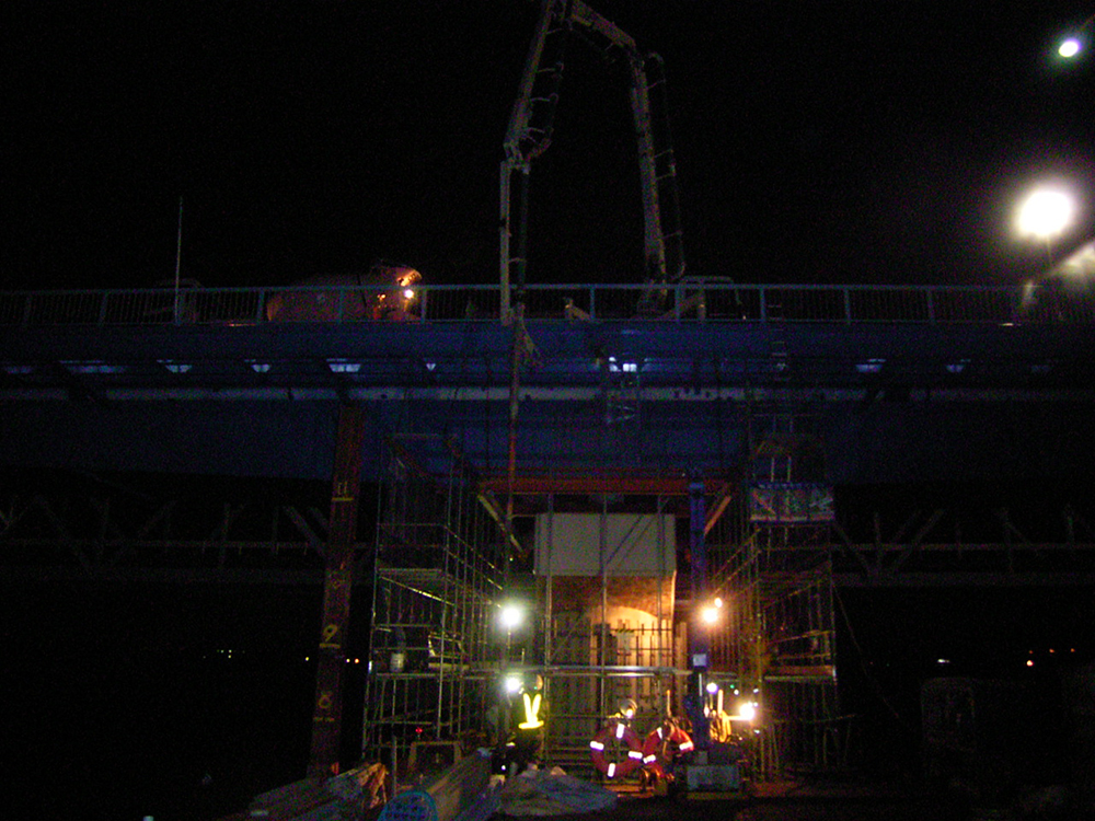 水中不分離流動化コンクリート施工は夜間施工であった。夜間の限られた時間内に所定の施工をすべて終えて交通解放する必要があるため、現場にはとてもピリピリした空気が流れていた。