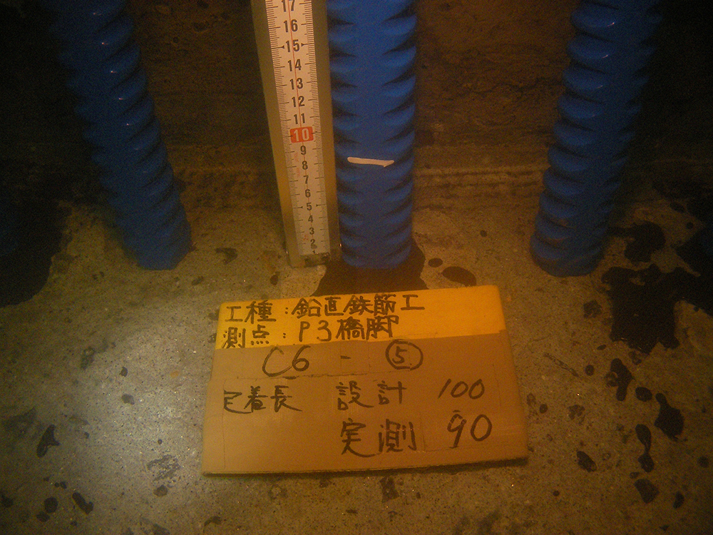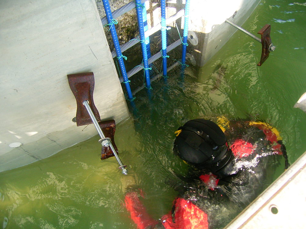 フーチング上のアンカー削孔は水中施工の内で最も大変な作業の一つであった。業者は所定の間隔で削孔できるよう、テンプレートを製作し、竣工図書の配筋図を頼りに既設鉄筋をさけて削孔したが、図面とのずれもあるため、非常に苦労した。また、既設鉄筋を避けアンカーが当初位置からずれたため、設計再照査が必要となった。