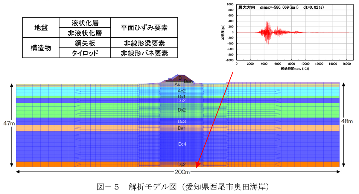 今回使用したFLIP ROSE 2D Ver7.3.1は2次元モデルであり、モデル化範囲は図―5のとおりで境界条件による影響を避けるため両幅100mとしている。地盤および構造物のモデル化は図表のとおりである。照査方法は、このモデルの工学的基盤面Dg2層(Vs=400m/s2)の下端に設計地震動を入力し、解析により得られた堤防の沈下量や対策構造物の部材応答値と限界値を比較し照査する。