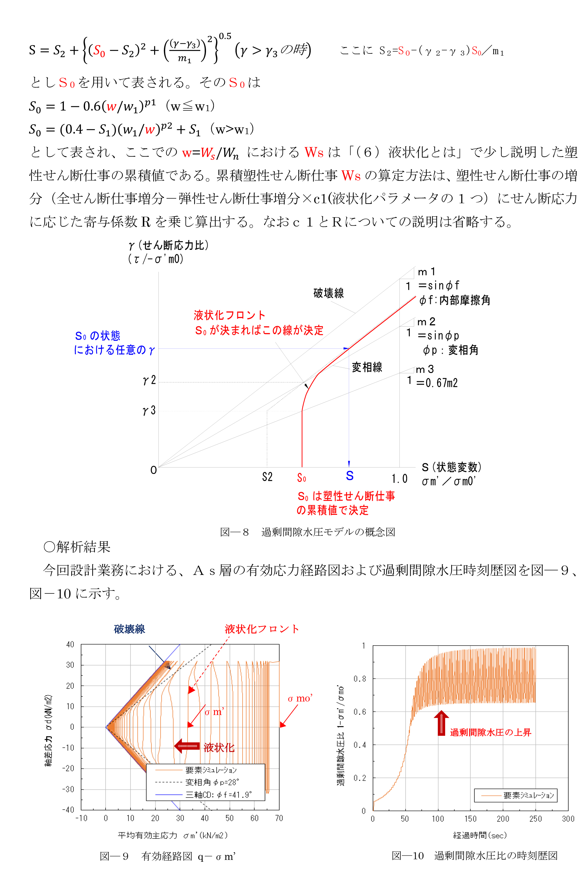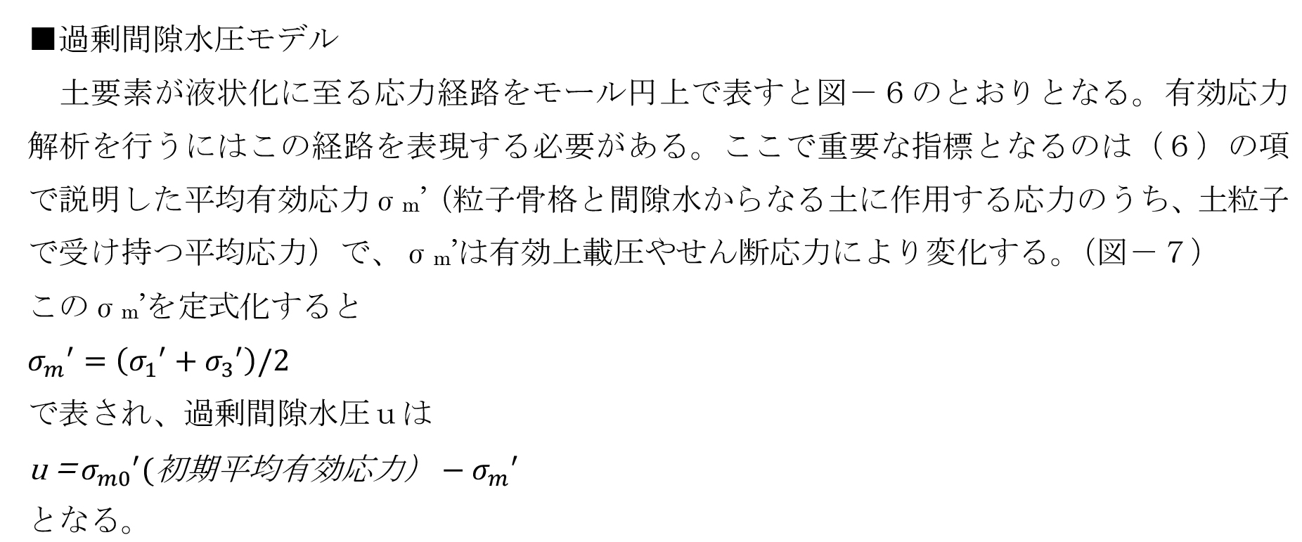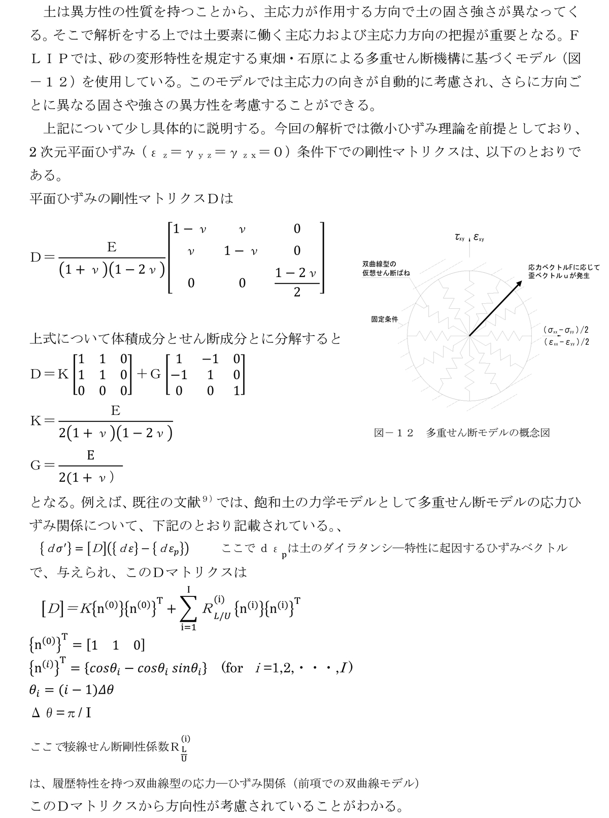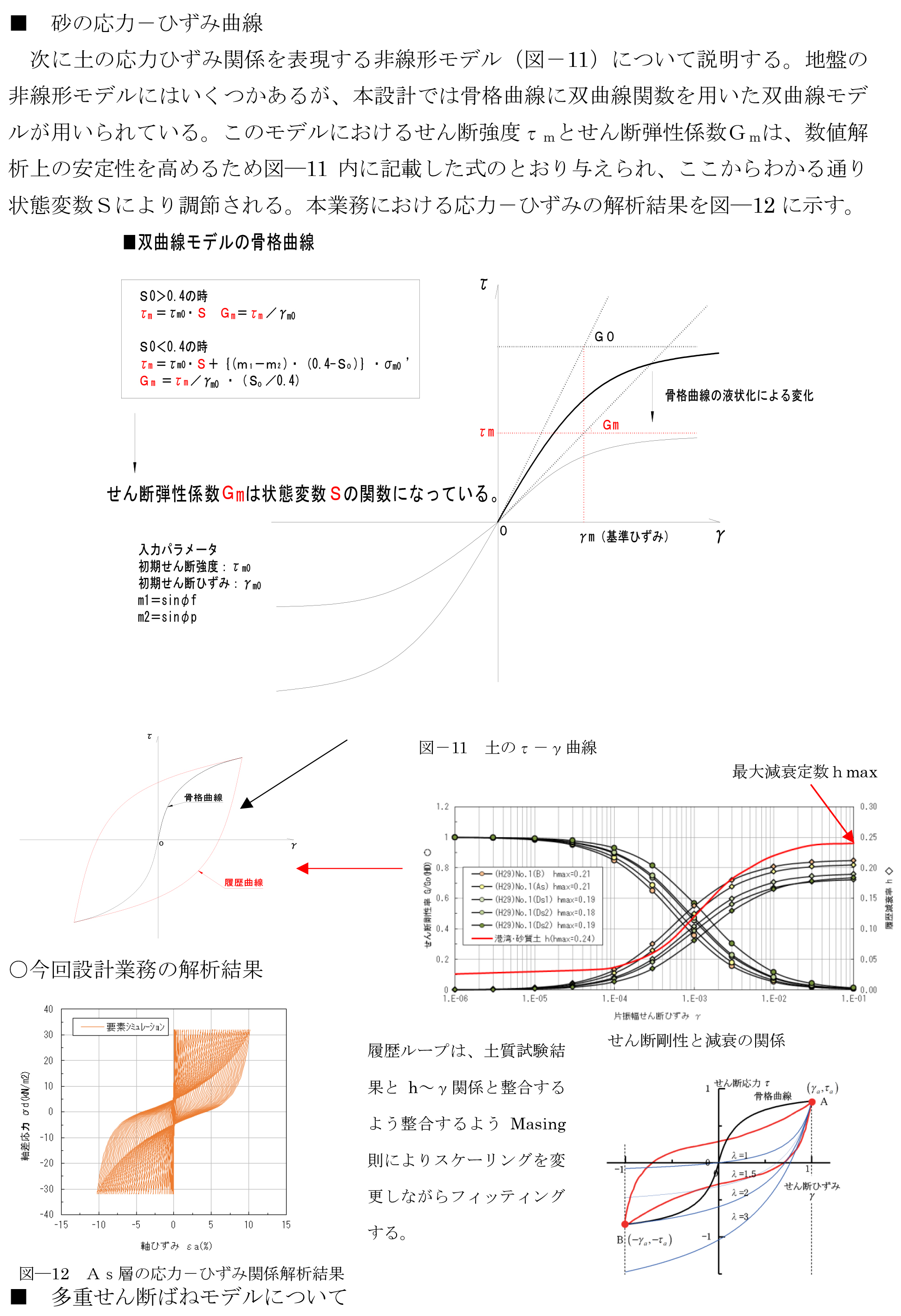 既往の文献4)~8)を参考にFLIPで特徴的な過剰間隙水圧モデル、砂の応力-ひずみモデル、多重せん断バネモデルの3つの内容について本設計での解析結果も含め紹介する。