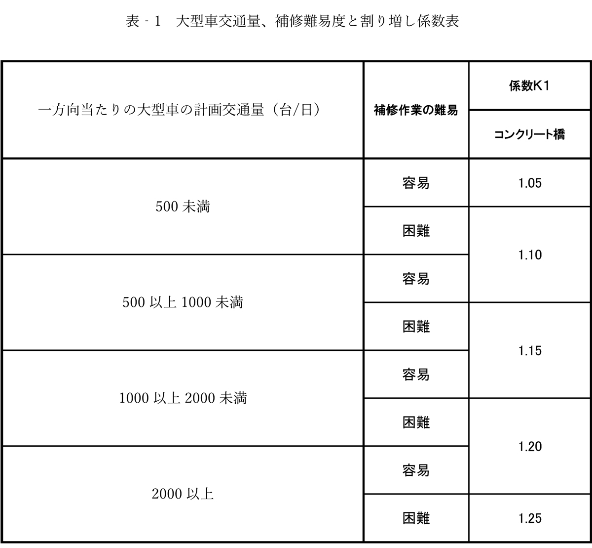 先にも示したが、鉄筋コンクリート道路橋は、自重と自動車荷重などの作用力によって部材断面に生じる引張応力を、鉄筋で補強した構造である。しかし、鉄筋コンクリート構造は、支間長を伸ばすと自重(死荷重)が増加し、長大化には限界があることは常識で、アーチ橋を除いて支間長30m以下(私がなぜここでアンダーラインを引いたのかが、この後ので述べる私の内容で分かる)が多くを占めている。また、鋼橋と異なって死荷重応力度が占める割合の大きい鉄筋コンクリート橋は、鋼橋と比較して余力が大きいことから、供用中の道路橋も厳しい塩害条件や多量の融雪剤を散布する地域を除けば、重大な損傷は少ないと考える。視点を変えて、車両荷重が直接乗る床版を考えてみる。鉄筋コンクリート床版の設計は、以前から床版厚さについて、表‐1のように1方向当たりの大型車計画交通量で割増係数を使って割り増しを行っていた。この考え方基本として鉄筋コンクリート道路橋の設計を考えていれば、少なくとも供用期間や交通量による明確な差異は生じないと考えるのが普通である。それでは前回に引き続き、定期点検(定期点検を始めて6回目の実施分)を行った道路橋から鉄筋コンクリート橋445橋を抽出し、分析した結果について説明しよう。