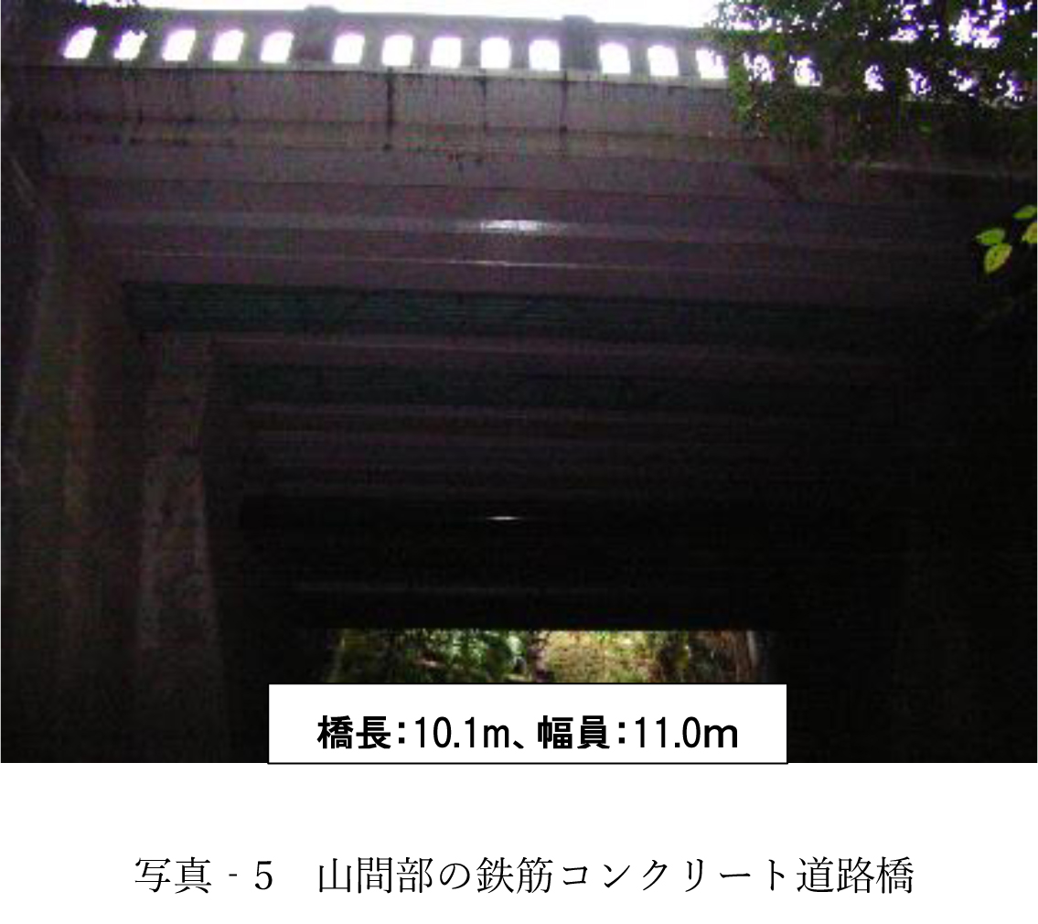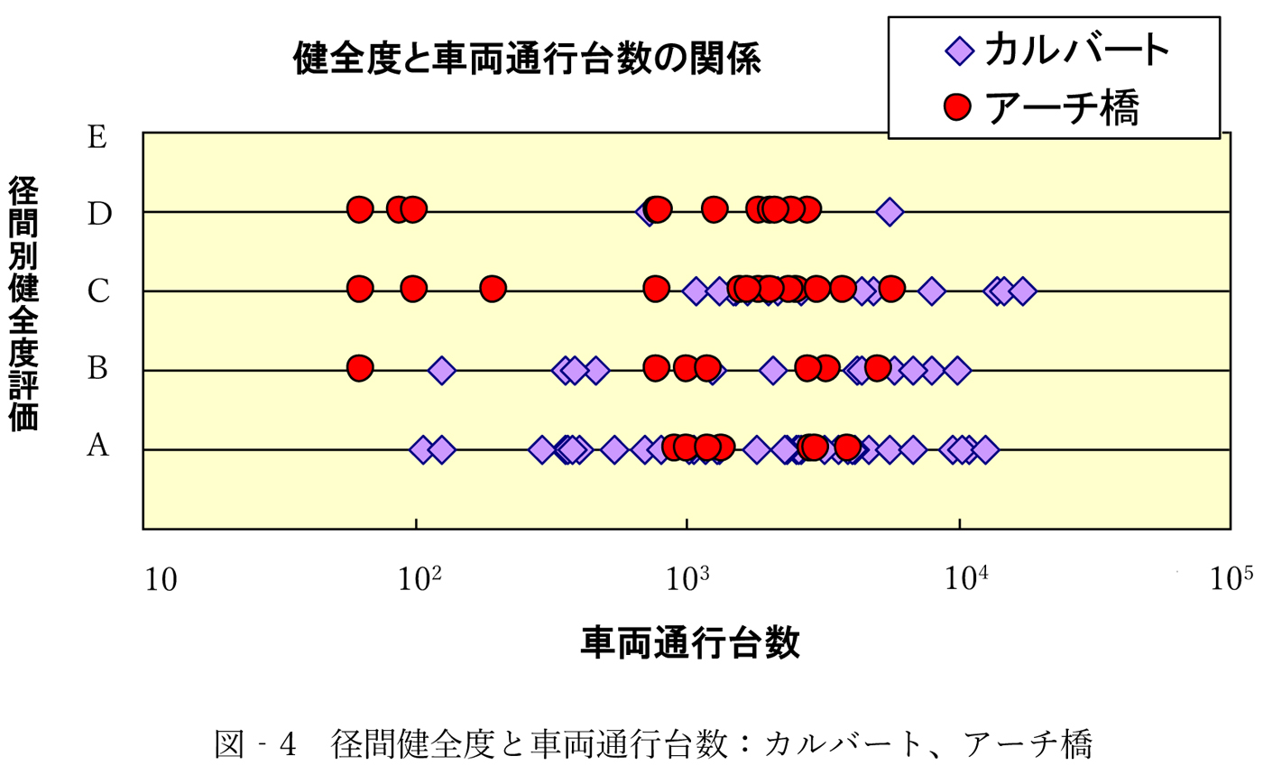 図‐3に桁橋、床版橋及びラーメン橋の健全度と車両通行台数の関係、図‐4にカルバート及びアーチ橋の健全度と車両通行台数の関係の分析結果を示した。ラーメン橋と床版橋は、いずれも車両通行台数が増加しても径間別健全度には大きな変化は見いだせなかった。桁橋の場合は、赤線楕円枠で示すように車両通行台数が増加すると健全度も悪化する傾向があるように見える。これもあくまで定性的な考えでの話ではあるが、写真-3は、田園地域の清水の流れる水路を跨ぐ道路橋で、建設後85年経過、通過交通量は、9,459台/日(大型車混入率15.6%である。発生している変状は、写真-4で明らかなように、桁端部、支承部付近に発生した顕著な鉄筋露出及びはく離現象である。写真-5は、山間部の生活道路に架かる道路橋であり、先の事例と同様な建設後85年経過、通過交通量は、5,237台/日(大型車混入率5.9%)である。当該橋梁には変状は殆ど無く、健全度はAランクの健全との評価となっている。