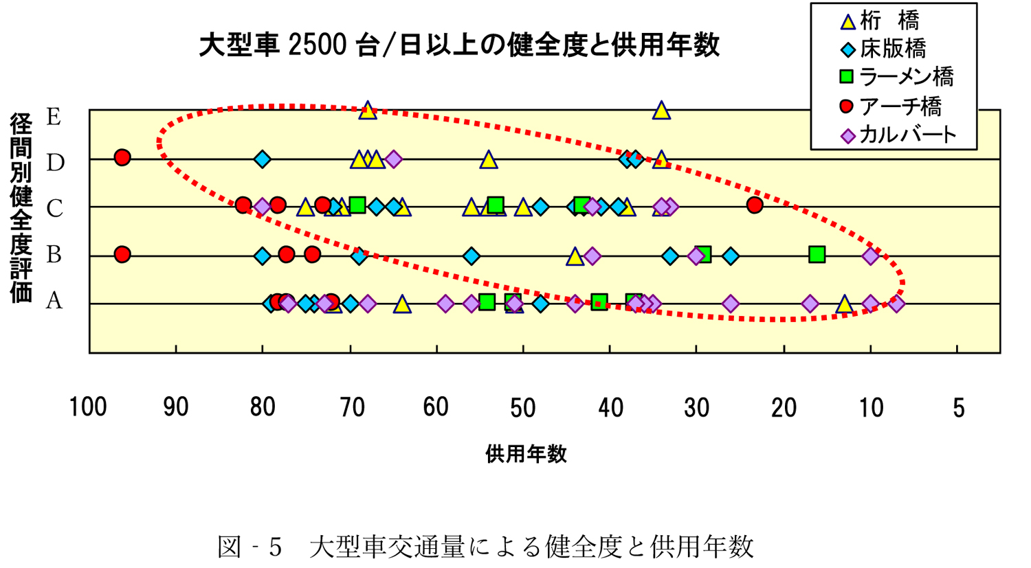 ここで私は、桁橋の場合は、多少交通量による差異あると考えた。カルバートやアーチ橋は桁橋とは異なって、コンクリート部材に作用する力として圧縮力が大きいためか、支間長が長くなっても健全度に大きな変化があるようには見えない結果となった。桁橋の分析結果から、自動車荷重による影響があるとすれば、T荷重、特に輪荷重の大きさに着目して分析すれば、より差異が明確になると考えた。この考え方を進めると、私は大型車の通行量が多ければ当然、疲労による変状や伸縮装置を通過する際の衝撃荷重も多いと思った。そこで、大型車両の多い路線に架かる道路橋の健全度と供用年数の関係について、分析してみた結果が以下である。図‐5が大型車の通行量が2500台/日以上ある鉄筋コンクリート道路橋の分析結果を示す。調査した構造別全てを捉えた傾向は、供用年数が長くなると健全度が悪化するように見えるが確定は出来なかった。カルバートを除く、桁橋、床版橋、ラーメン橋及びアーチ橋は、供用年数が長くなると健全度が悪化するように見えるので、取り纏めた結果を使って統計処理(回帰分析)したところ、予想に反して相関係数は低い値となった。以上が、鉄筋コンクリート道路橋の自動車交通量及び大型車交通量の影響を分析した結果である。