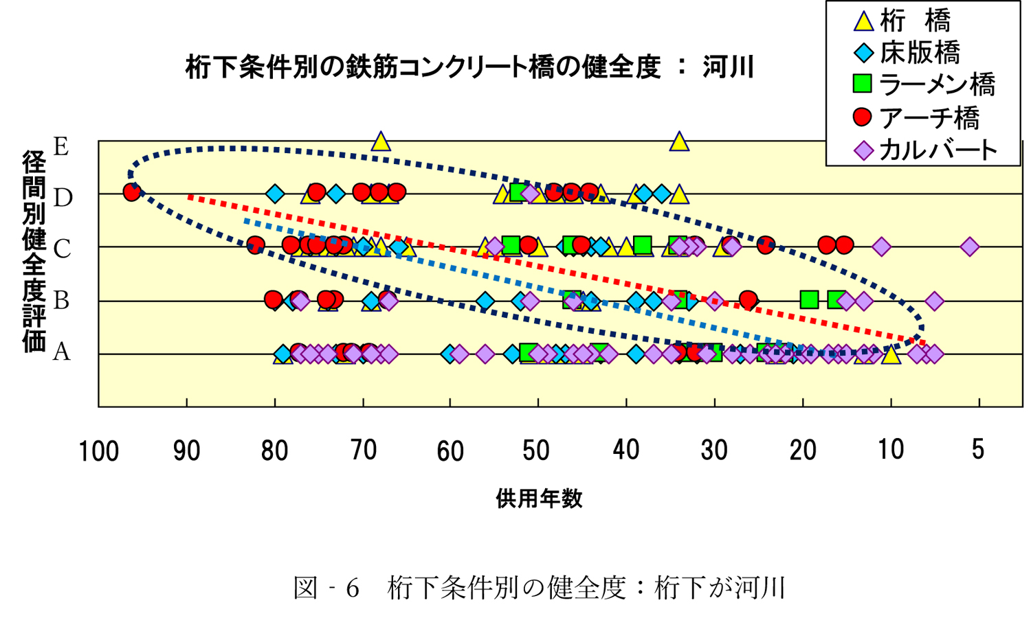 一般的に鉄筋コンクリート道路橋は、河川(特に、水路)を跨いでいる場合が多い。横断する水路は、川幅が短いことから桁下高さも低くなり、流水に浸かったり、湿気が籠ったりし易い環境といえる。また、市街地の場合は、水路に家庭の雑排水が流れ込む場合も想定され、健全度を悪化させる要因の一つとしてあると考えた。図‐6は桁下が河川(水路を含む)の鉄筋コンクリート橋を分析した結果である。赤の破線はアーチ橋、青の破線(線形)は床版橋の傾向を示したものであるが、いずれの場合も相関が高いとは言えない。全構造を対象とした傾向は概ね青色破線楕円弧と理解されたい。この結果から健全度が悪化するのは、やはり経年によることが支配的と考えられる。