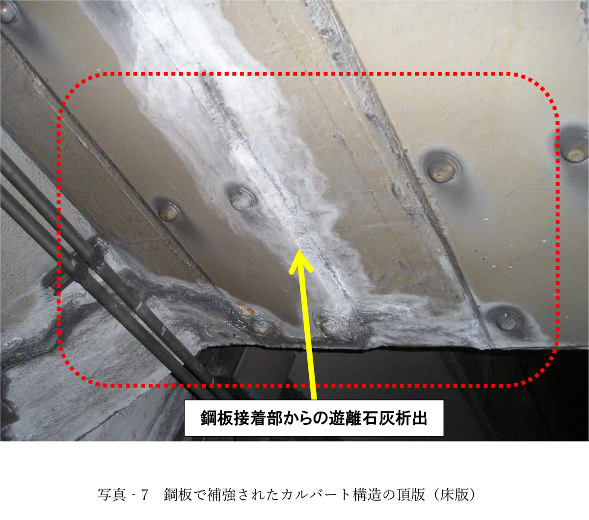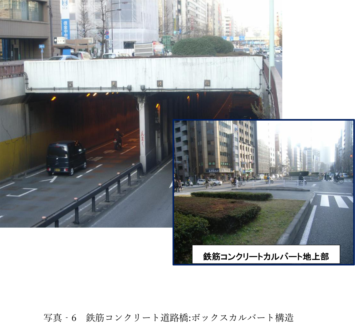 桁下高は、建築限界からある程度確保されているとは思うが、径間長が短いことから自動車から排出されるガスの影響が想定される。全体の傾向は、青の破線で示すように経年による健全度悪化が見られるがこれも断定できるほどではなかった。ここで鉄筋コンクリート道路橋と言うよりもトンネル構造物とする方が相応しい事例を紹介しよう。写真-6は、幹線道路のアンダーパスであるが、構造形式はボックスカルバート、道路と交差することから適合する基準は道路橋示方書を使い、一等橋として設計された道路橋扱いとなっている。橋長は、147.0m~58.5m、幅員は25.4m~13.6mの中柱のある鉄筋コンクリート2ボックス構造である(一般的なボックスカルバート道路橋とは、規模、使用環境が大きく異なっている)。道路橋として使われているのは、全面積の40%程度で、残りは緑地帯等として使われている特殊な構造体である。当該箇所を含め同一路線の同構造の橋梁は、供用開始後55年経過し、作用荷重の変更(TL-20からT-25)やひび割れ、漏水等の変状発生から鋼板接着工法によって補強した。