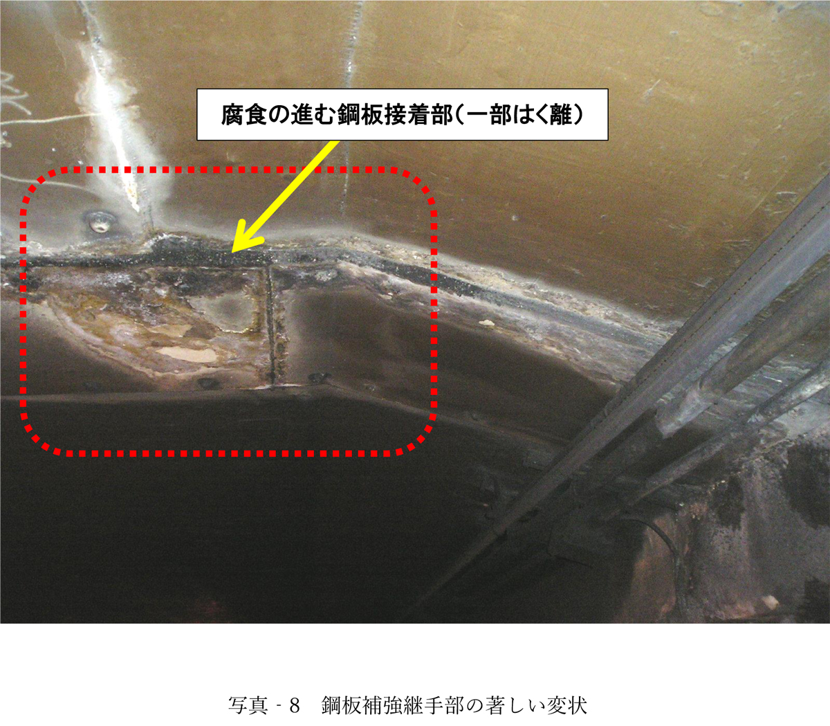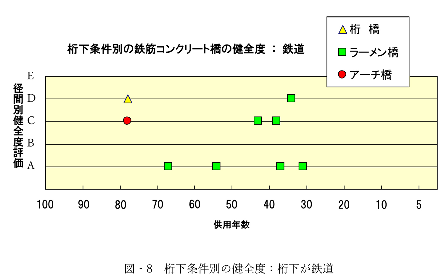 写真-7及び写真-8で明らかなように、補強された鋼板の継ぎ手部や断面変化点付近で遊離石灰の析出が顕著で、一部に鋼板の腐食や空洞などが確認されている。都市内構造物として、種々地域で数多く見られる構造形式ではあるが、外観からトンネンル構造に近いためか道路橋として認識されずに、発生している重大な変状を見落としがちな事例が多い。図‐8は、桁下が鉄道の場合である。鉄道を跨ぐ鉄筋コンクリート橋の数は少ないが、電化の進んだ現状では、昔の様に機関車から排出される煤煙による影響は無く、周辺環境による健全度悪化が主と思われる。図‐9は、桁下が公園や駐車場として使われている場合の分析結果である。桁下の環境が良好であることから、当然健全度の悪化勾配は青色の破線で示したように低く、他の桁下環境と比較して劣化速度は遅いと言える。