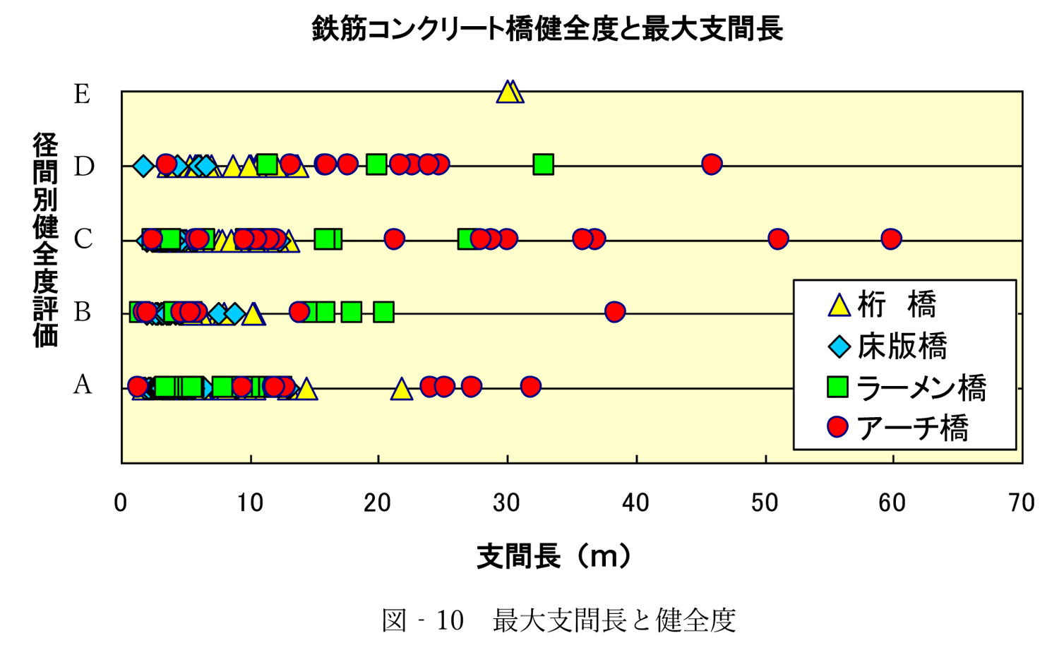 一般的に道路橋の場合、支間長が長くなると自動車荷重(活荷重)の影響を受けやすいと言われている。そこで、構造別の最大支間長橋梁を抽出し、健全度との関係を分析した結果が図‐10である。図‐10で明らかなように、支間長が長くなると採用される構造はアーチ橋やラーメン橋が多くを占め、床版橋は10m未満が圧倒的である。最大支間長に着目した分析結果は、私が予測したようにはならず、支間長が長くなると健全度が悪化する傾向とはならなかった。