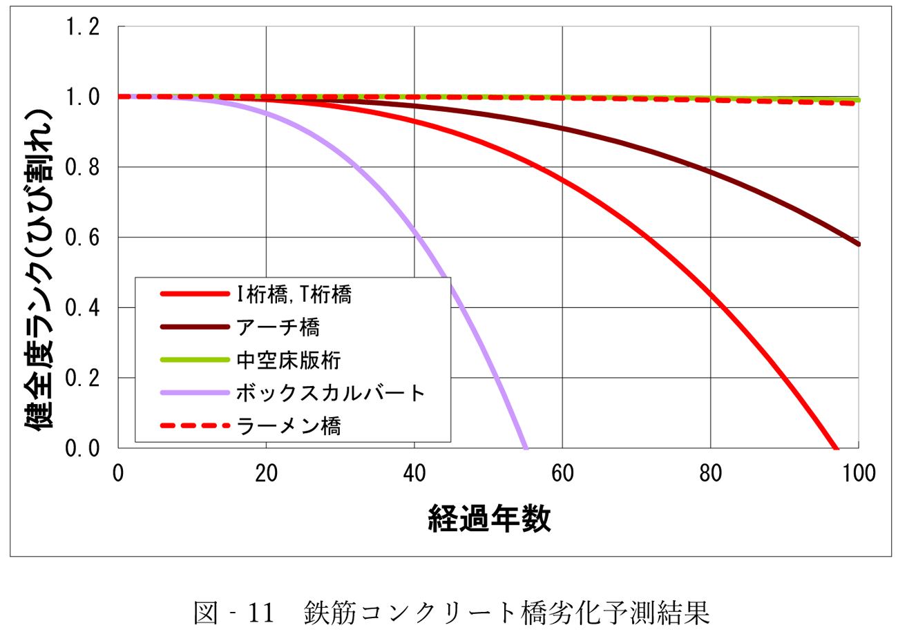 の分析を始める前、当然ボックスカルバートよりも、桁橋の劣化速度が速いものと想定していた。しかし、予想に反して図-11で明らかなようにボックスカルバート構造の劣化が最も早く、寿命に至る経過年は60年弱となった。この理由は、先のトンネル構造に近似しているアンダーパス形式の道路橋の変状が大きく影響したものと推測される。また、先に示したボックスカルバート構造の道路橋は、一般的な開削方式で築造された都市トンネルで発生している変状と同様とも考えた。その理由は、開削工法で築造した矩形トンネルは、構造体の継ぎ手部のひび割れ、漏水や遊離石灰析出、基礎杭が無いことなどから躯体の不同沈下し、多くの問題を抱えていることが近年明らかとなったからである。