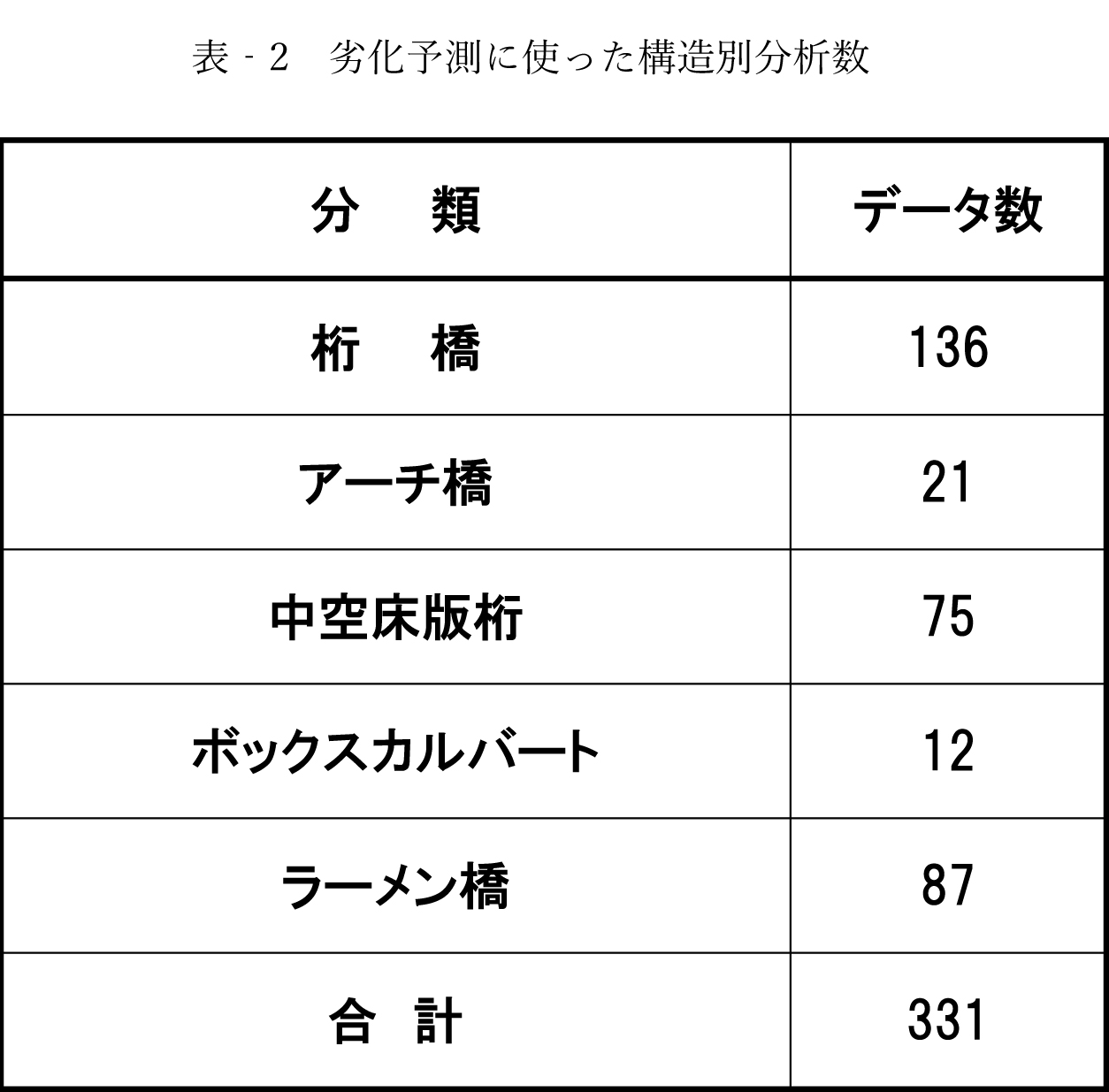 今回の分析では、先に分析した定期点検結果のデータではなく、その次に行った定期点検結果のデータを使うこととした。その理由は、先の分析資料を調べると、アンダーパス・ボックスカルバートが中柱を耐震補強していたために、変状が正しく反映されていないことに気づいたのが理由だ。再調査に使った対象橋梁数を表-2に示す。調査・分析は、対象橋梁を絞り込み、構造別の劣化予測式を算出することとした。私は、今回