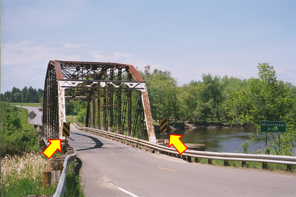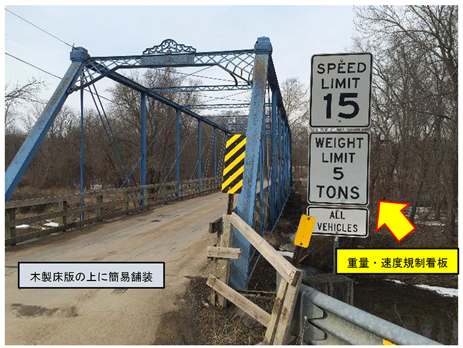 アメリカ合衆国に行かれ、道路を走行された方は目にしていると思うが、郡や市が管理する道路の橋梁には、規制看板が設置されている事例が数多くある。写真-17は、ミシシッピー川を渡河するD道路橋であるが、主構および路肩位置を示す道路標識設置し、通行の安全を確保している。当該橋梁は、比較的交通量の少ない郡管理の道路橋であるが、写真-18で明らかなように床版は、国内では考えられない木製であった。