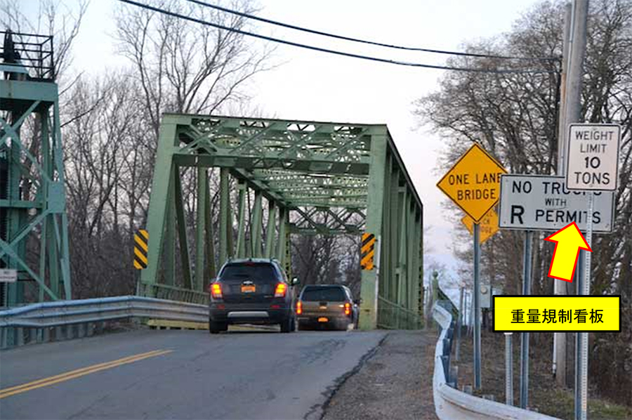 左:写真-19 重量5t、速度15マイルに規制された道路橋