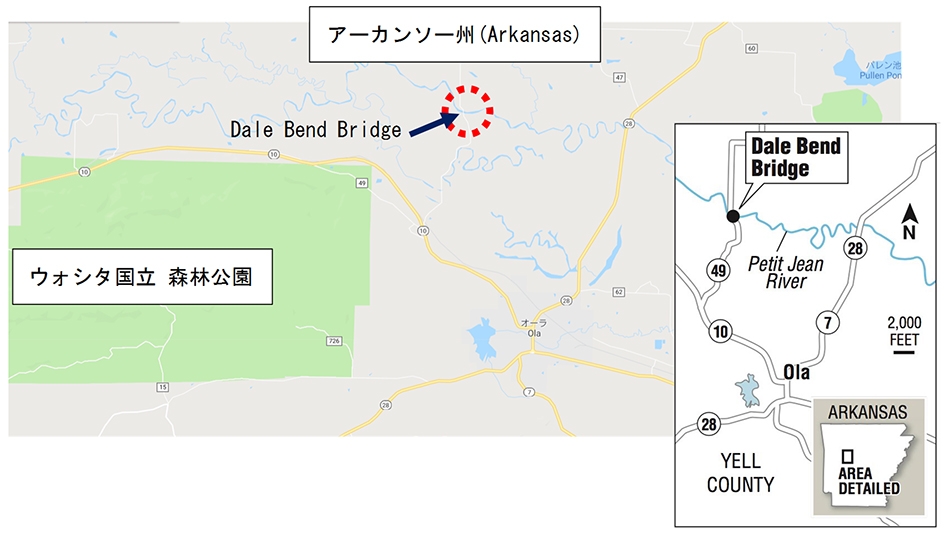 2019年1月30日(水曜日)の夜8時頃、アメリカ合衆国・アーカンソー・Arkansas州のYell Countyの北東部にある『Dale Bend Bridge』が落橋した。『Dale Bend Bridge』の位置は、図-5に示したが、アーカンソー州のウォシタ国立森林公園(Ouachita National Forest)の北側、田舎町オーラ(Ola)の近郊にある。
