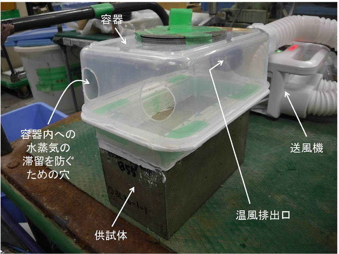 現在は、施工前にコンクリート部材の水分量を適切に減らす方法、および、その管理方法について検討を行っています(写真-7、8)。写真-7は、冬期に水分を多く含む部材への施工を想定し、低温下に曝された水分を多く含むコンクリートに温風をあて、表層(シラン系表面含浸材の含浸域)の水分を減少させるための適切な加温方法・時間を検討している様子です。ここでは、温風が気中に拡散して加温の効果が薄れることを防ぐため、表面を(ここでは容器で)覆い、その中へホースを差し込んで温風を送り込み、加温しています。あわせて、水蒸気が滞留しないよう工夫を施しています。