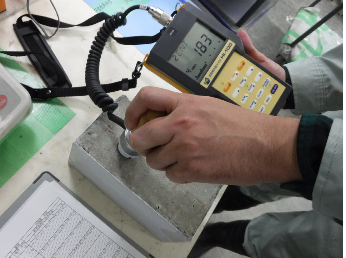 写真-8は、加温による表面の水分変化を調べている様子です。一般に塗布時の表面の水分状況は、表面から深さ40mmまでの範囲の水分状況を均等に評価する高周波容量式の水分計で管理されることが多いです。しかし、コンクリートの表面と内部で水分状況が異なる場合(加温によって表面の水分は減少するものの、内部は水分が残留)、表面の水分状況を高周波容量式の水分計で適切に評価できないことがあります。そこで、10mm間隔で2本配置されている長さ20mm、幅5mmの導電ゴム製の電極をコンクリート表面に押し当てて電流を流し、電極間の電気抵抗が水分によって変化する原理を利用して表面の水分状況を評価する電気抵抗式の水分計を使用し、適切な管理値の提案に向けて実験を重ねています。これらの成果も今後、ご紹介できればと思っています。