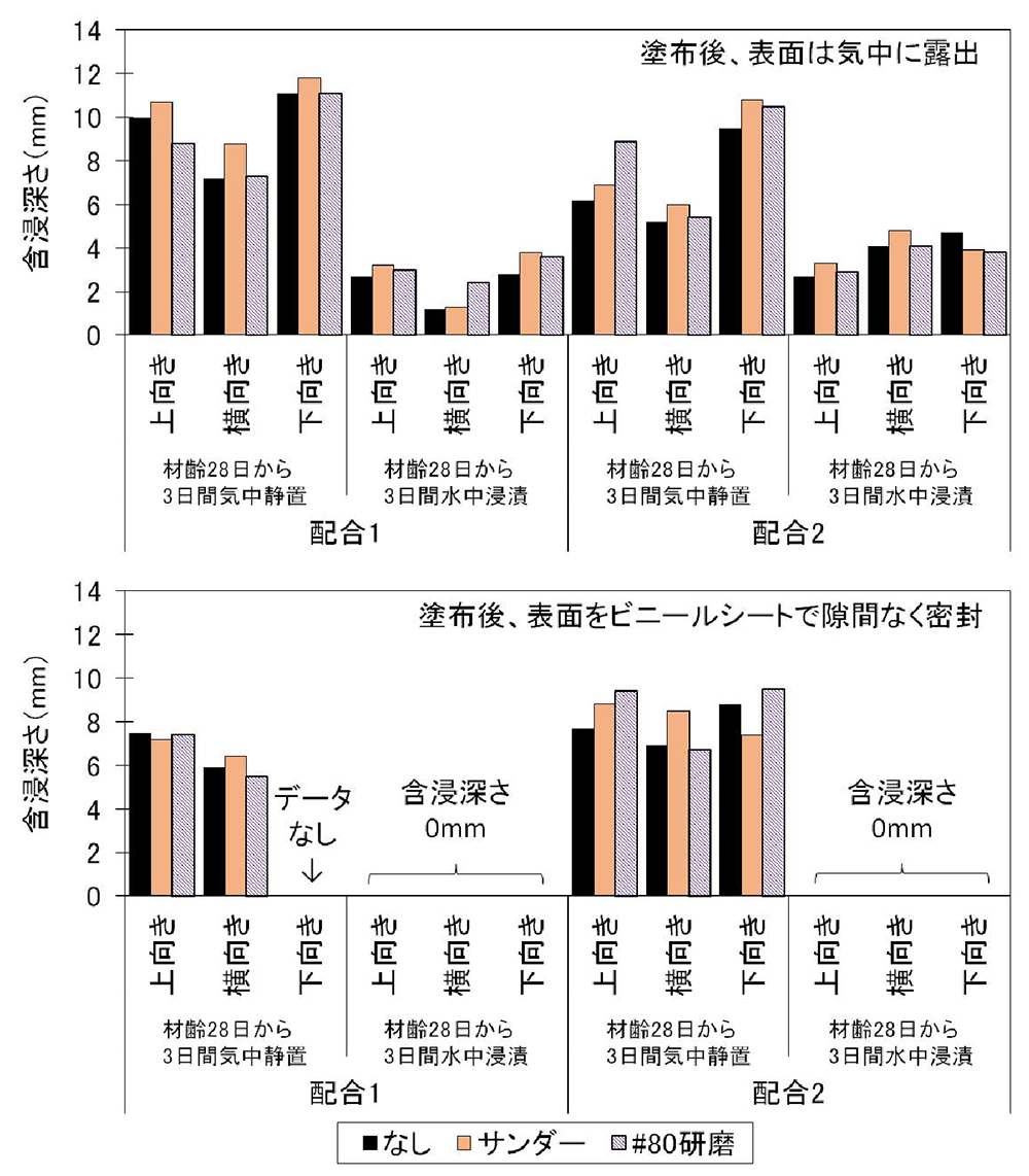 コンクリートに含まれる水分が少ない場合は、塗布後に表面を密封することでシラン系表面含浸材の逸散抑制により含浸深さが増加する場合もありますが、基本的には水分の影響が大きく、塗布前に表面の水分を確実に小さくすることが、なによりも大切と言えます。