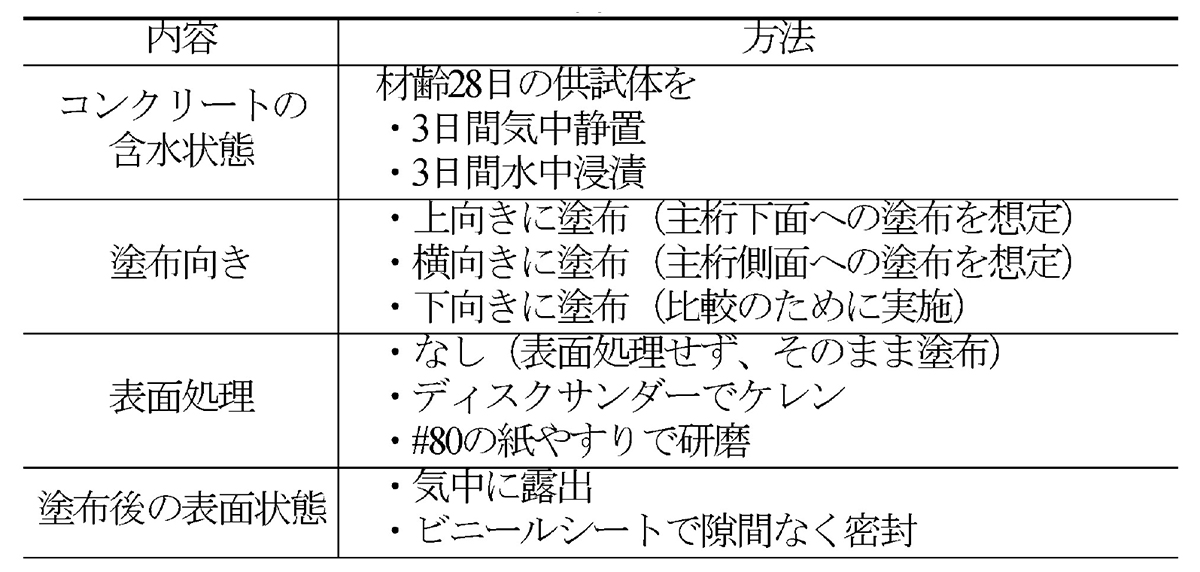 シラン系表面含浸材は、表-2の「材料3」を使用しました。ここでは、表-4に示すように、コンクリートの水分状況、塗布向き、表面処理、塗布後の表面状態に着目して実験を行いました。水分状況については、材齢28日のコンクリート供試体を3日間、気中静置もしくは水中浸漬させることで違いをつけました。塗布向きは、主桁の下面と側面への塗布を想定した上向き(写真-6)と横向き、および比較として下向きの3通りとしました。塗布作業は刷毛で行いました。レイタンスや汚れなど含浸を阻害する要因を除去するための表面処理については、なし(そのまま塗布)、ディスクサンダーによるケレン、#80の紙やすりによる研磨の3通りとしました。塗布後の表面状態については、気中に露出もしくは揮発するシラン系表面含浸材の外部逸散を抑えるためにビニールシートで隙間なく密封する方法の2通りとしました。含浸深さの測定は塗布から7日後に行いました。