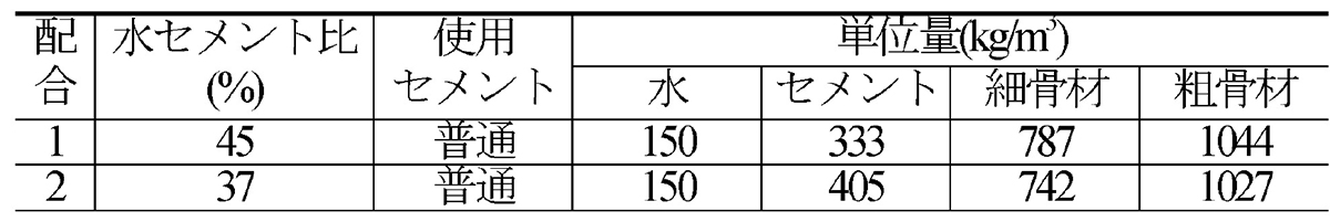 表-3はコンクリートの配合です。セメントは普通ポルトランドセメントを使用しました。配合は、北海道開発局道路設計要領の海上及び飛沫帯のPC桁に適用する配合条件[5]をもとに、最大水セメント比(45%)にあわせた配合1および設計基準強度(40N/mm2)にあわせた配合2の2パターンを準備しました。配合2の材齢28日(水中養生)の圧縮強度は53N/mm2です。打設後、封緘養生を7日間行い、その後は材齢28日まで常温室内の気中に静置しました。