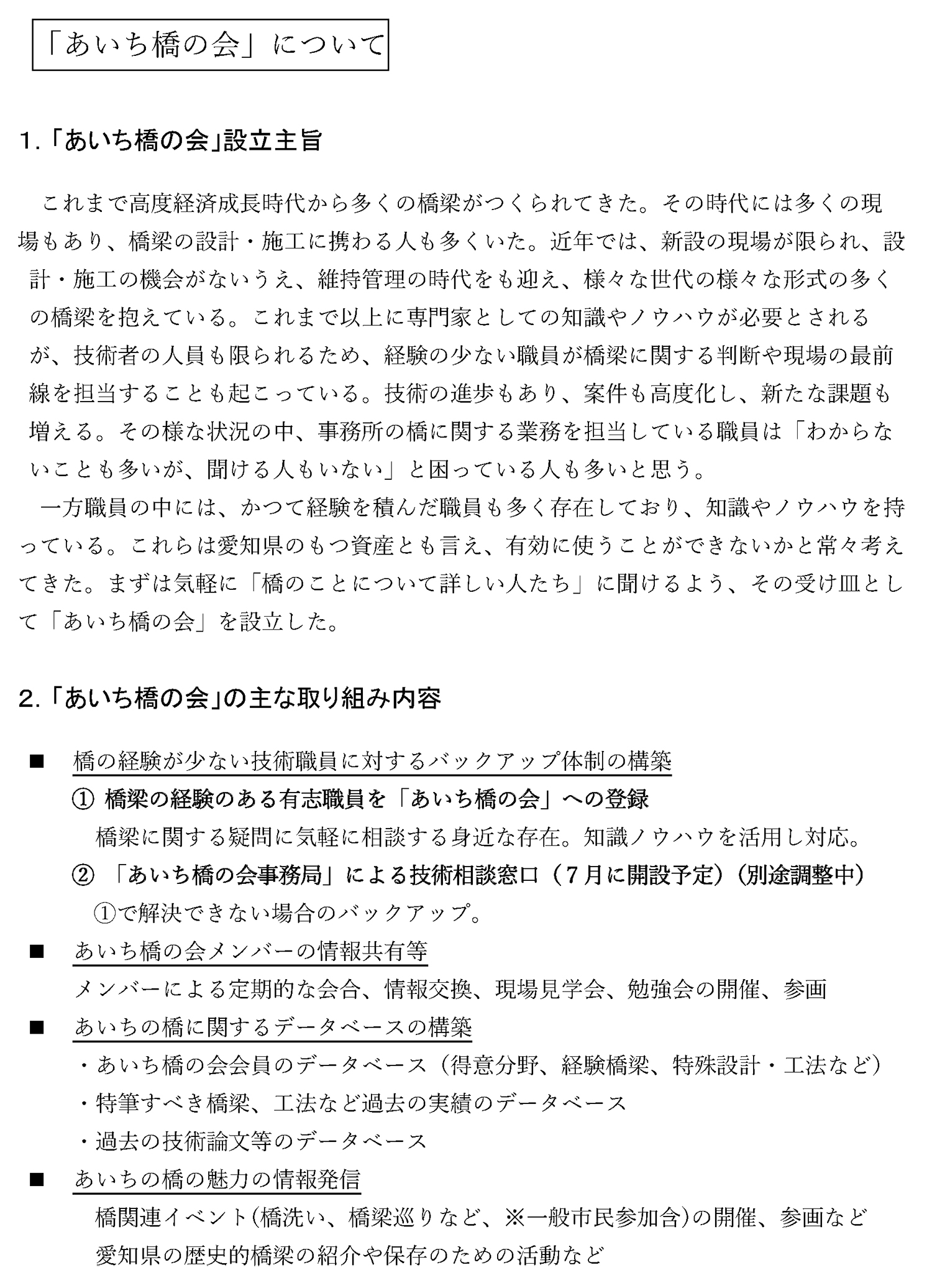 私は今、かつて橋梁を経験した職員の仲間とともに「あいち橋の会」という組織を立ち上げ、運用しようとしています。