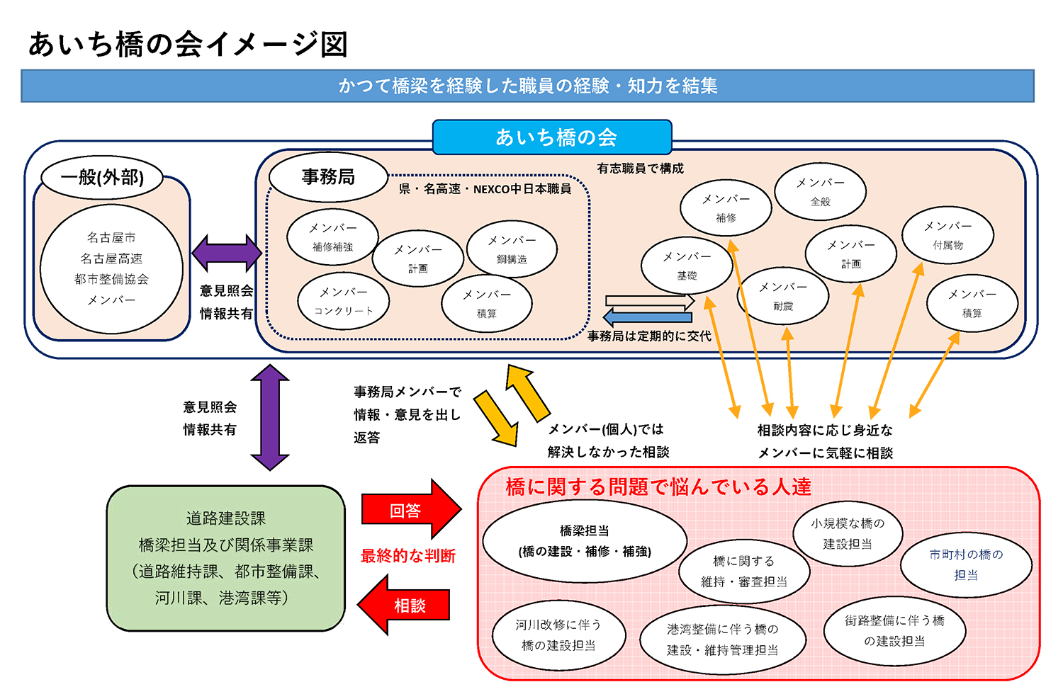 そこで、かつての橋梁を経験した有志職員に、自ら経験した橋梁や、年代、工種、得意分野などを書き添え「あいち橋の会」に登録していただき、橋の経験が少なく困っている職員から、気軽に相談を受ける存在になってもらうことから始めようと考えました。