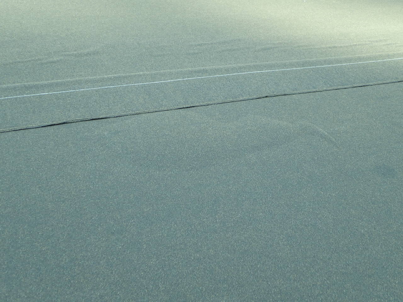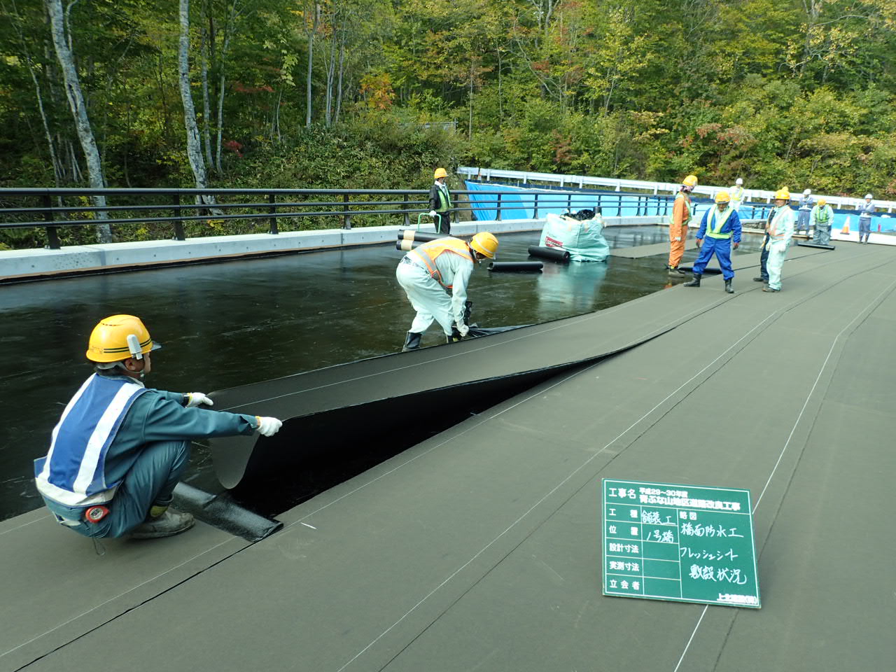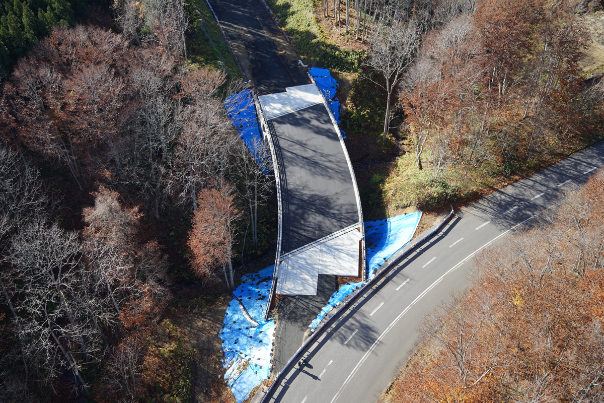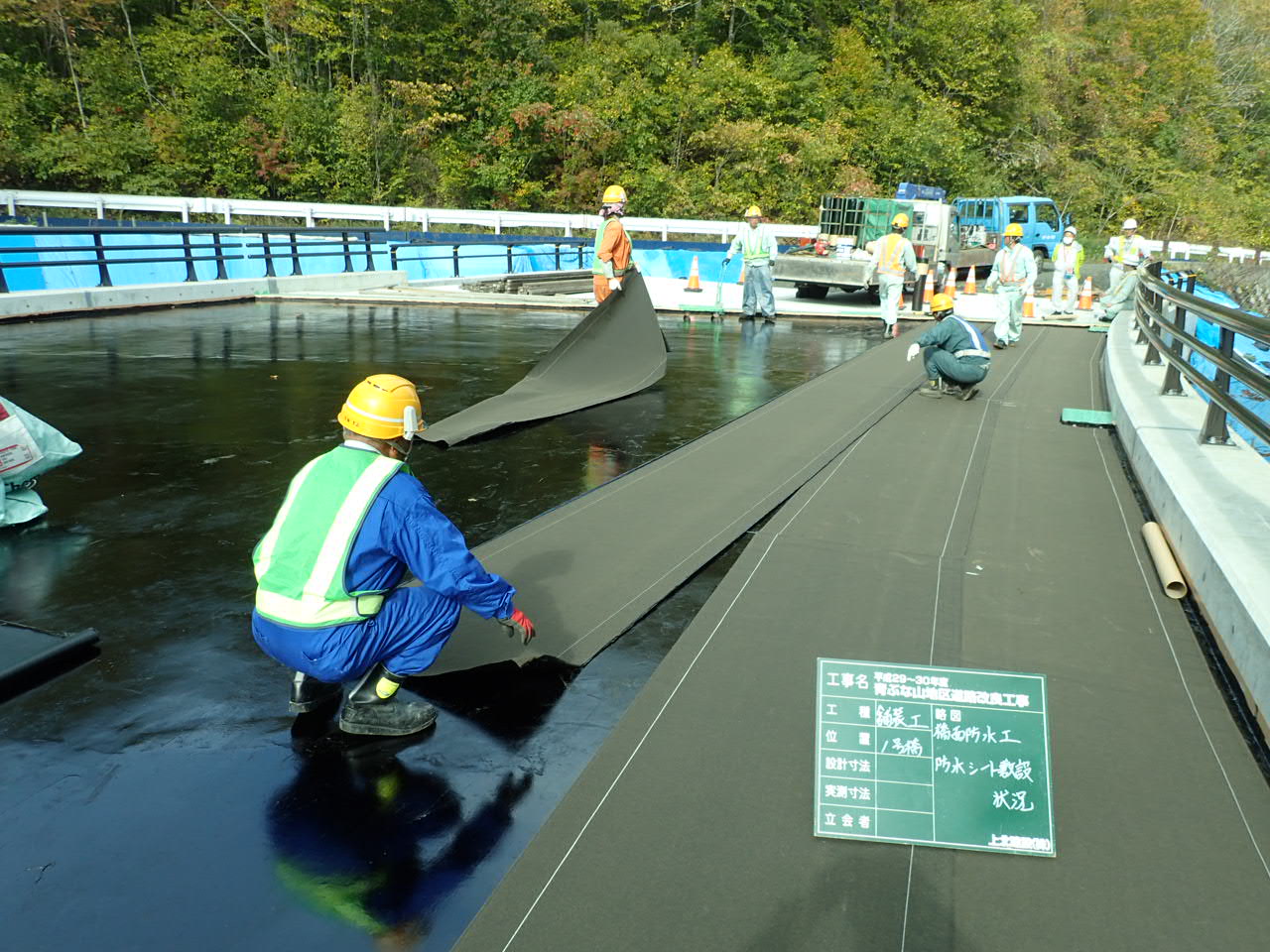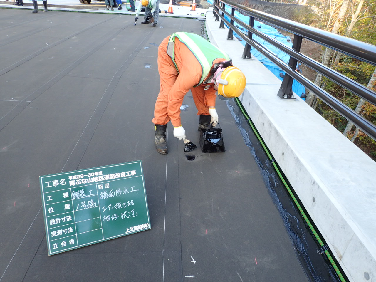 音道 青森県でシート防水による施工がきちんとできる業者は1社しかありません。シート防水はどうしても付着力が弱く、とりわけ斜角が入っていると、シートはまっすぐしか貼れないため、継ぎ目が数多く発生してしまいます。シートと床版の間にも空気が入りやすくなります。曲線橋や斜橋では、シート防水はあまりよくないと思います。シートの継ぎ目が多く発生していると舗装の平坦性にも影響してきます。