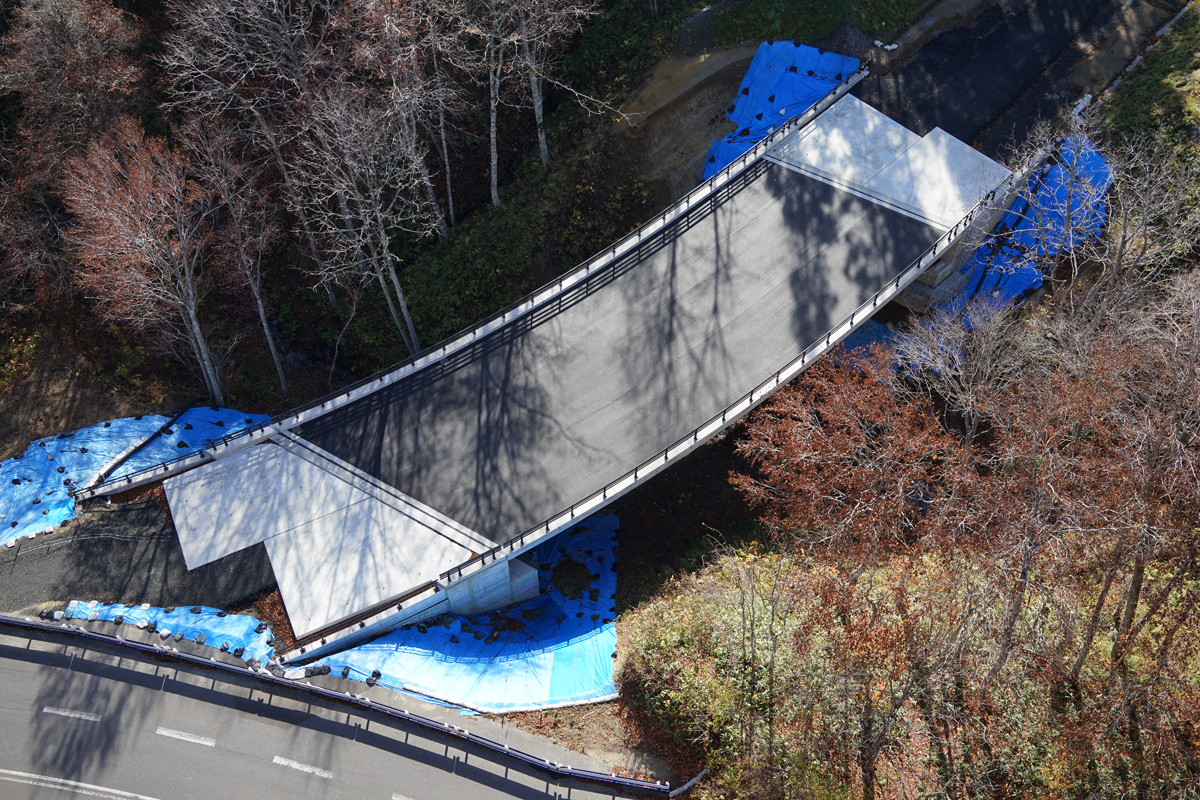 斜角かつ曲線が入っている橋梁での床版防水工は難しい(写真は舗装完了状況)