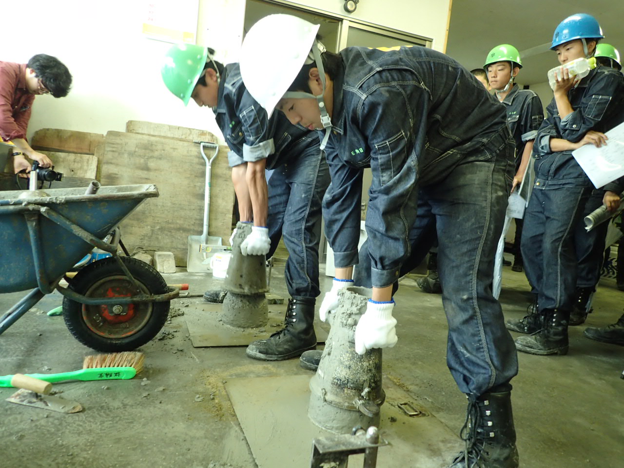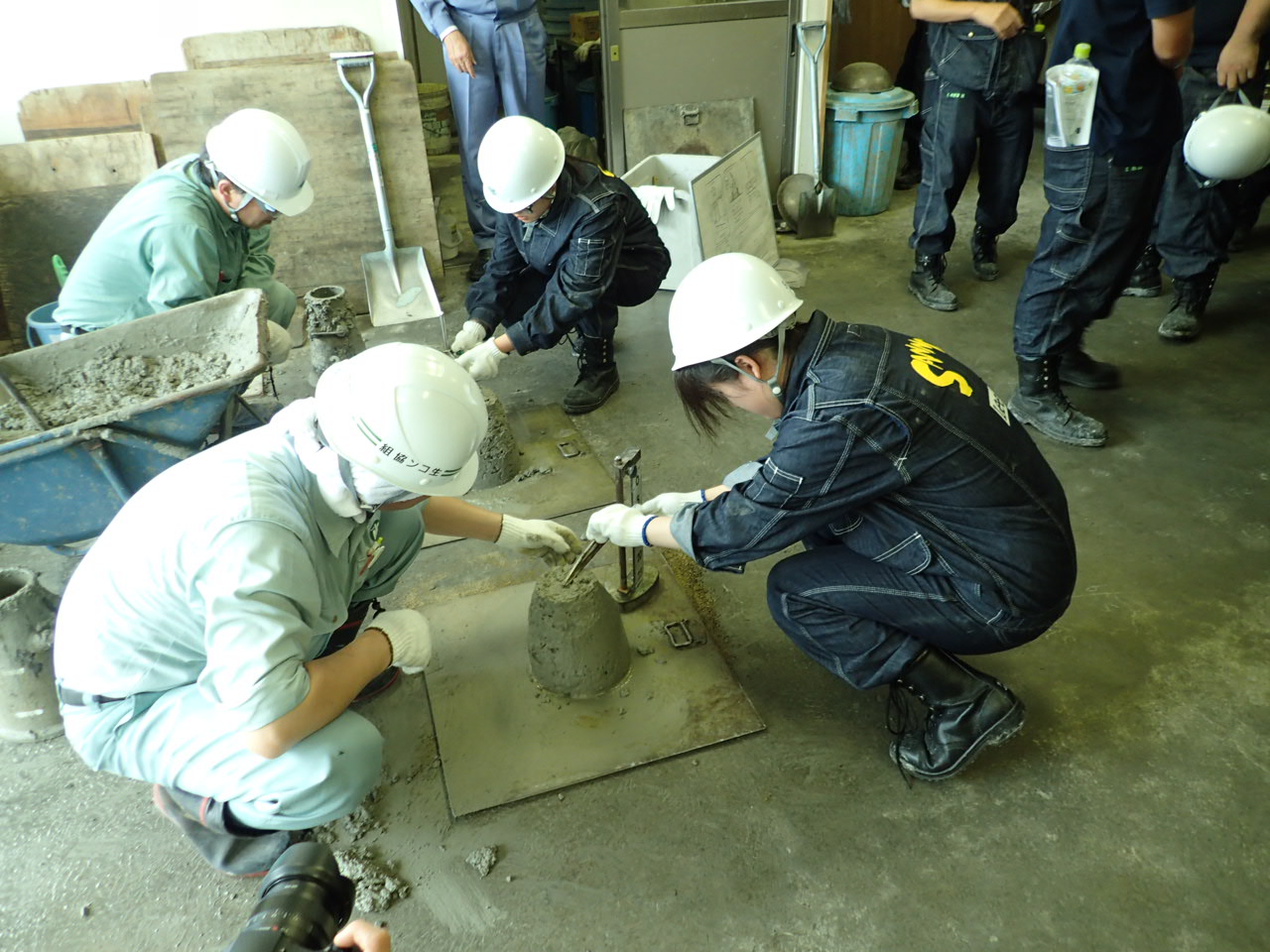模擬床版の施工時の見学の時、大きな枡箱を用意して、その中にコンクリートを入れてバイブレータをかける体験をさせてあげたりもしました。重いバイブレータを用いてバイビングすることの大変さを感じてもらえたと思います。生コンで汚れることも含めて、建設の現場というのを知ってもらえたと思います。