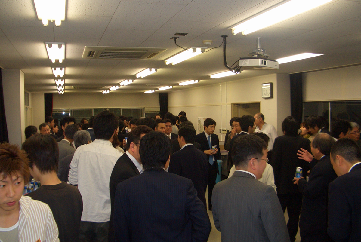 「コンクリート材料―構造の最先端技術に関する研究会」と題して、毎回、特定のテーマを設定し、私自身を含む6名の講師に登壇していただくものでした。テーマは、ひび割れ、塩害、発注者の役割、など当時の私が本当に議論したいことを、たこつぼにならないように「材料―構造」と幅広く勉強するような講師陣をお願いして、魅力的な研究会となるように全力を尽くし、誰でも参加できる形としました。毎回100名を超える参加者があり、盛り上がりました(写真1)。研究会の後、土木工学棟のセミナー室で乾きものと飲み物で、ぎゅうぎゅう詰めの懇親会を行い(写真2)、その後に40名弱の大懇親会を横浜駅周辺で行いました。講師の方々には、旅費も謝金も支払いませんでしたが、講師の皆さんも他の講演を聴いて、そして懇親会で満足していただけるように努力しました。