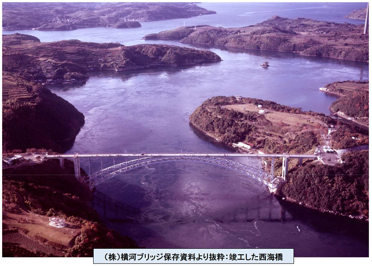 ここまで、読者の多くの方が知らない吉田巖さんの生い立ちから、西海橋(伊ノ浦橋)の設計までをポイントを絞ってお話しした。図-7は、村上所長、吉田巖さん他ワンチームが戦後の混乱期に、東洋一の規模で竣工させた伊ノ浦橋(西海橋)のカラー写真である。
