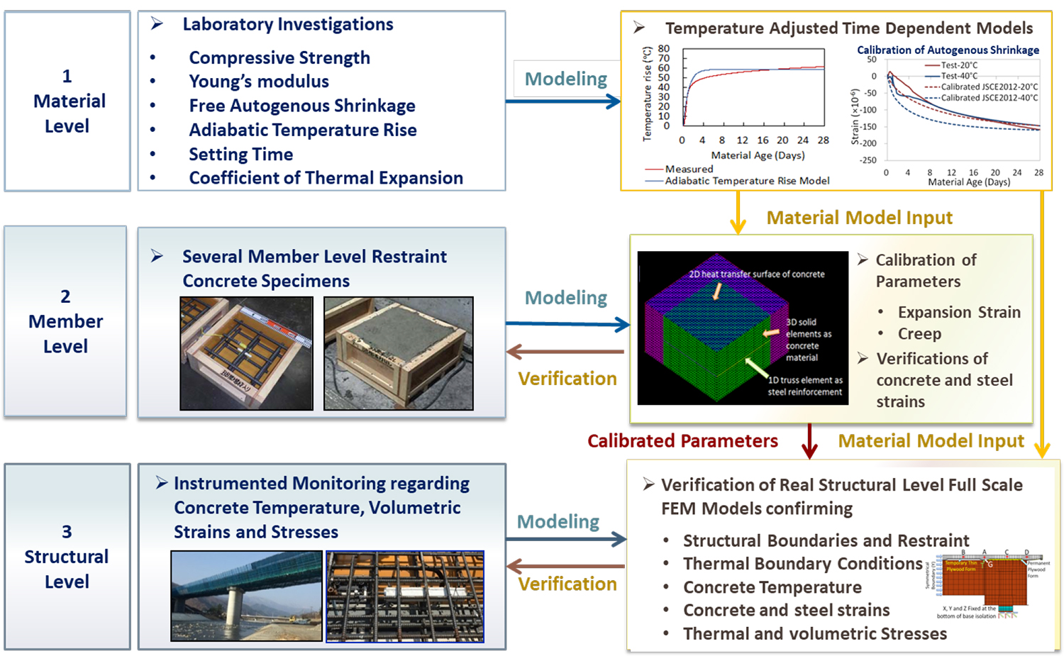 図2 材料・部材・構造物の3段階で検証を行った温度応力解析3)