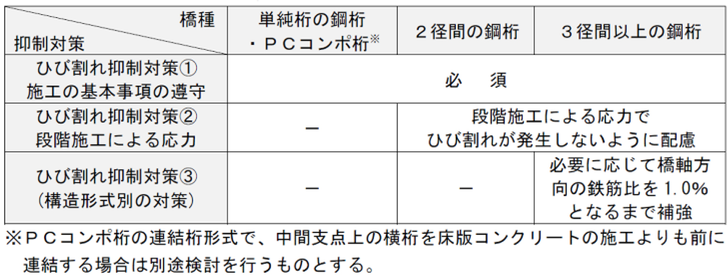 結果としては、表1に示すようにひび割れ抑制対策を取りまとめました2)。どの構造形式についても、施工の基本事項の遵守は必須です。試行工事において、高耐久床版の施工の基本事項についての知見が蓄積され、RC床版用の施工状況把握チェックシートが開発され、手引きに包含されています2)。単純桁の鋼桁やPCコンポ桁については、施工の基本事項を遵守することで、ひび割れ抑制対策とみなしてよいこととしました。一方で、連続桁については、径間数に応じて、追加のひび割れ抑制対策を検討することとしました。以下に、それぞれの構造形式についての対策を設定した根拠を概説します。