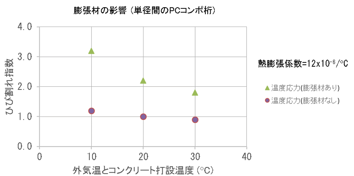 これまでの試行工事において、単純桁の場合は、竣工検査までに床版本体にひび割れの発生は確認されていません。試行工事の実績からも、単純桁のひび割れのリスクは大きくはないと想像されます。 図4に温度応力解析から得られた、材齢28日までの湿潤養生期間中の最小のひび割れ指数を示しました。単径間のPCコンポ桁で、コンクリートの熱膨張係数を12×10-6/℃と仮定した場合の、膨張材の効果を示しています。膨張材が無い場合、28日の湿潤期間中の最小ひび割れ指数が1.0程度となる場合もあるため、この手引きにおいては膨張材の使用を標準としました。さらに、膨張材を使用する条件において熱膨張係数と打込み温度をパラメータとした数値解析を実施したところ、図5に示すように、28日の湿潤養生期間中の数値解析による最小のひび割れ指数が、最も厳しい条件設定においても2.0程度であることが確認できました。湿潤養生終了後の乾燥収縮の影響は考慮できていませんが、現実の単径間の橋梁に竣工検査までにひび割れが確認されていない観察結果と合わせて、「手引きに示す基本事項を遵守した施工を行うことで、ひび割れ抑制対策とみなしてよい」としました。なお、PCコンポ桁の場合は、下面が埋設型枠のために、供用開始後もRC床版の下面からの乾燥が生じないため、ひび割れリスクの観点からは非常に有利な構造であると考えられます。