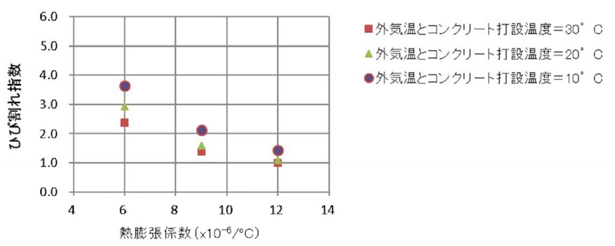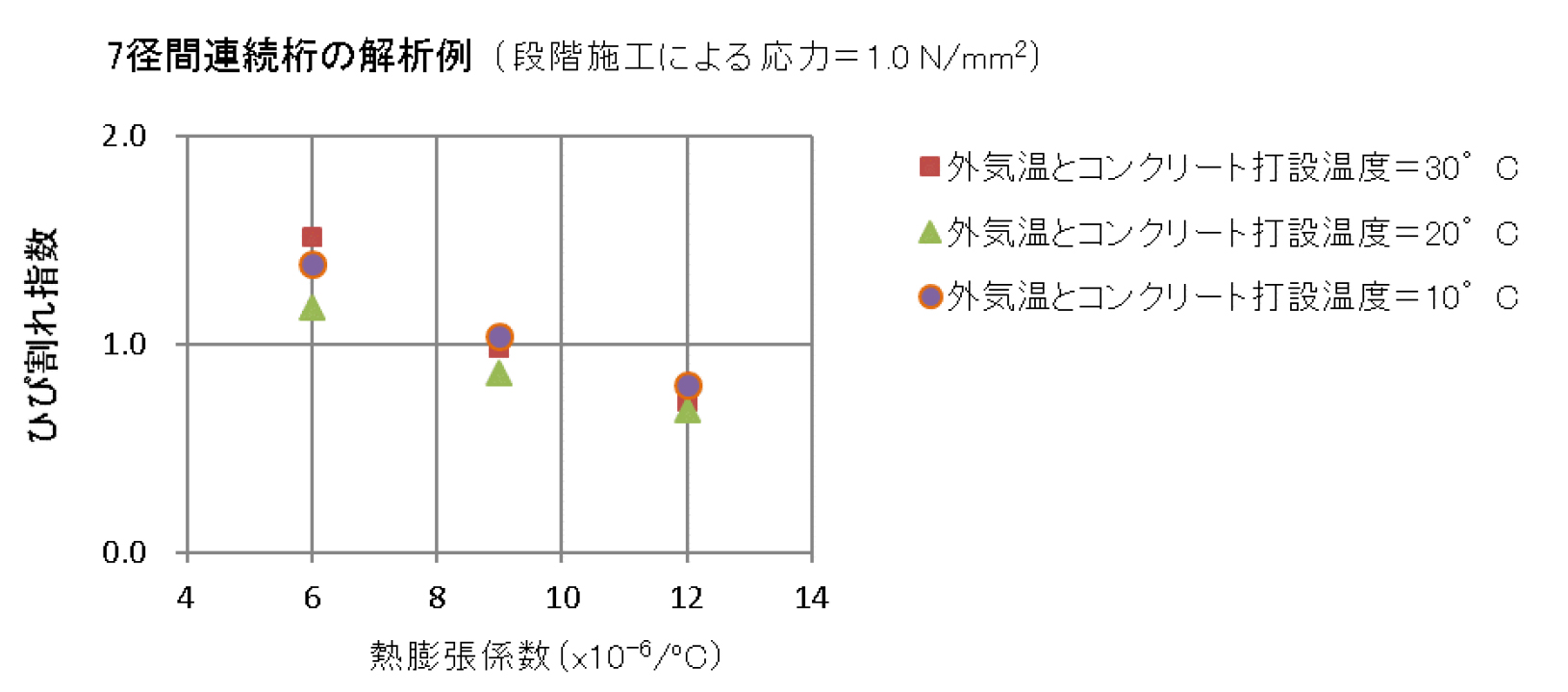 図6は、鋼2径間連続箱桁橋のRC床版の温度応力解析において、コンクリートの熱膨張係数ごとに、外気温およびコンクリートの打込み温度を10~30℃のケースで計算した結果を示しています。この解析結果に、段階施工による応力は考慮されていません。材齢28日までの湿潤養生期間中の最小のひび割れ指数は、2径間の鋼連続桁による外部拘束の影響が大きいために、単径間の場合と比べて小さくなる傾向が認めらました。しかし、解析の結果から、最も不利な条件となる熱膨張係数が12×10-6/℃の場合でも、すべてのケースでひび割れ指数が1.0程度以上を確保できることが分かりました。