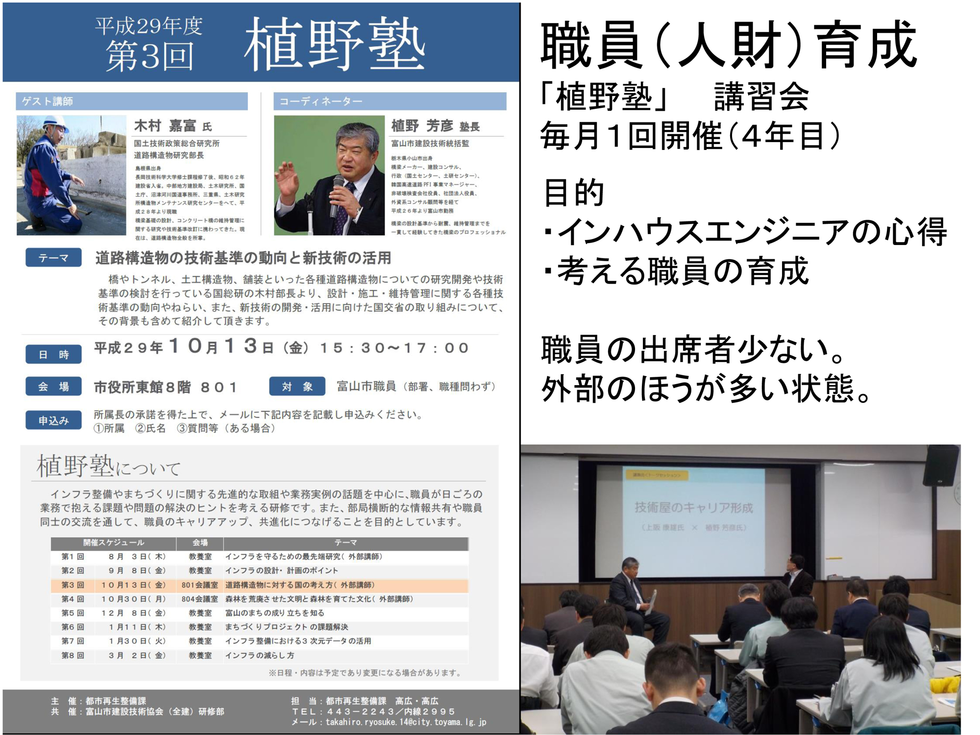 全国の橋梁の70%以上は自治体で管理しているので、自治体のほうが悩みが深いはずである。先日、議員さんから呼び止められた。地元業者が「植野はひどい奴。何とかしろと」と言っているようである。これは3年前から言われているし悪口は言われるくらいでないと影響力が無いと思っている。信念を持ってやっている。情けない連中だと感じてしまう。滑稽である。まず、業務の難易度により4段階に分けた。高度な業務は、大手コンサル、簡単な業務は地元と。そしてさらに、業務の成果内容に関して担当者に評価点を付けさせている。それを持って次年度の指名件数を決めている。つまり、前年度の評価が悪いと次年度の指名件数は減る仕組みだ。もっというと、今年怠けていると来年は無いという、当たり前の結果なのだ。最近、100点満点で30点台の業者が数社ある。担当者に確認したところ、「自分の気持ちだ」という事である。どういうことか想像が付くだろう。長年培われた、官民双方の甘えの構造が、悪い影響を与えてしまっている。